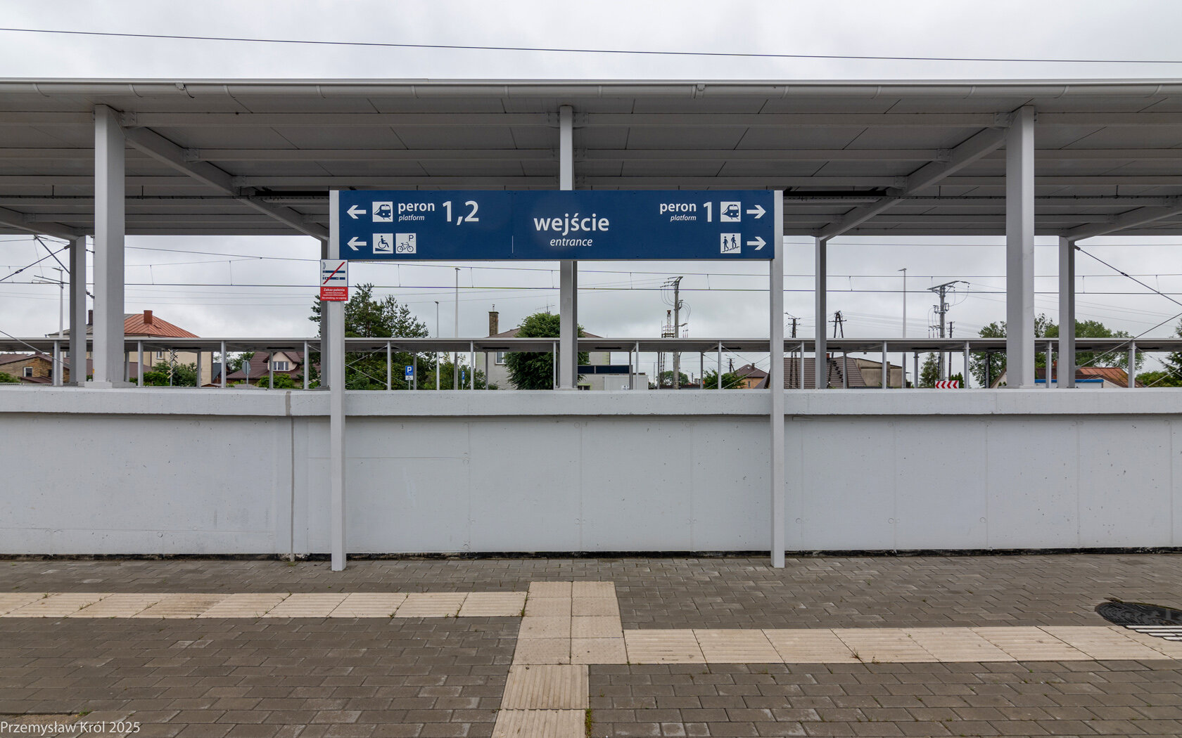 Na końcu peronu ustawiono tabliczkę kierunkową wskazującą kierunek opuszczenia platformy.