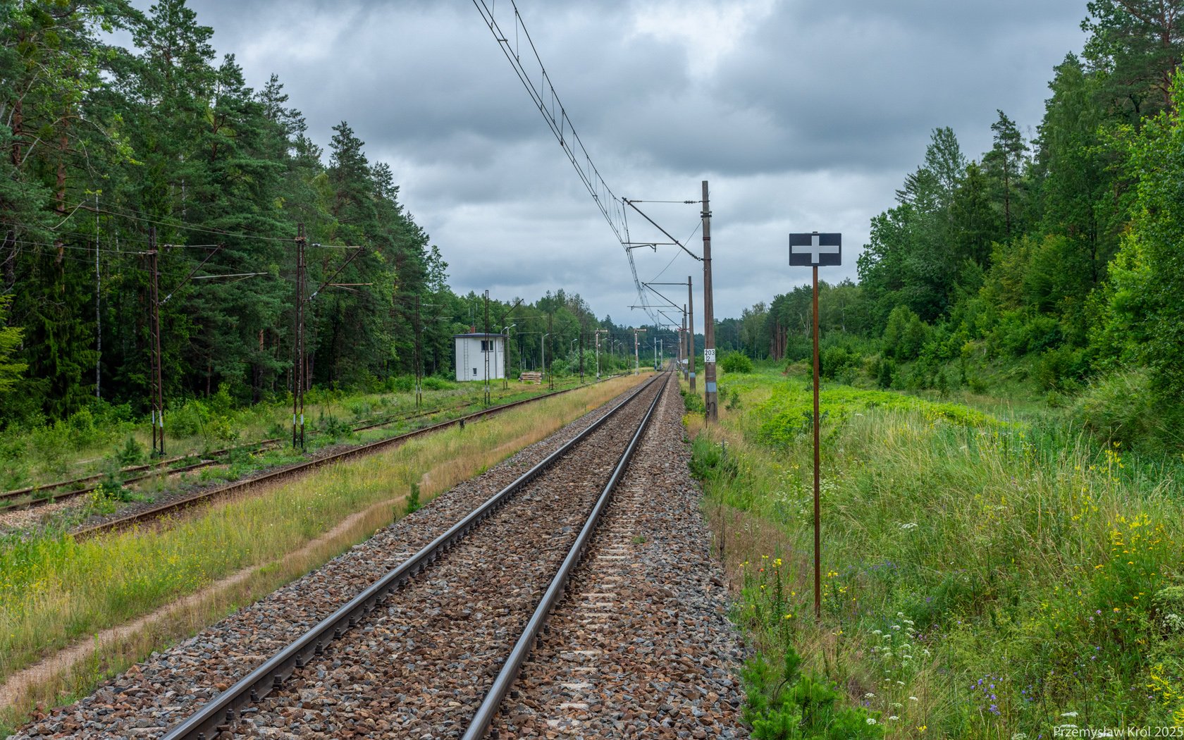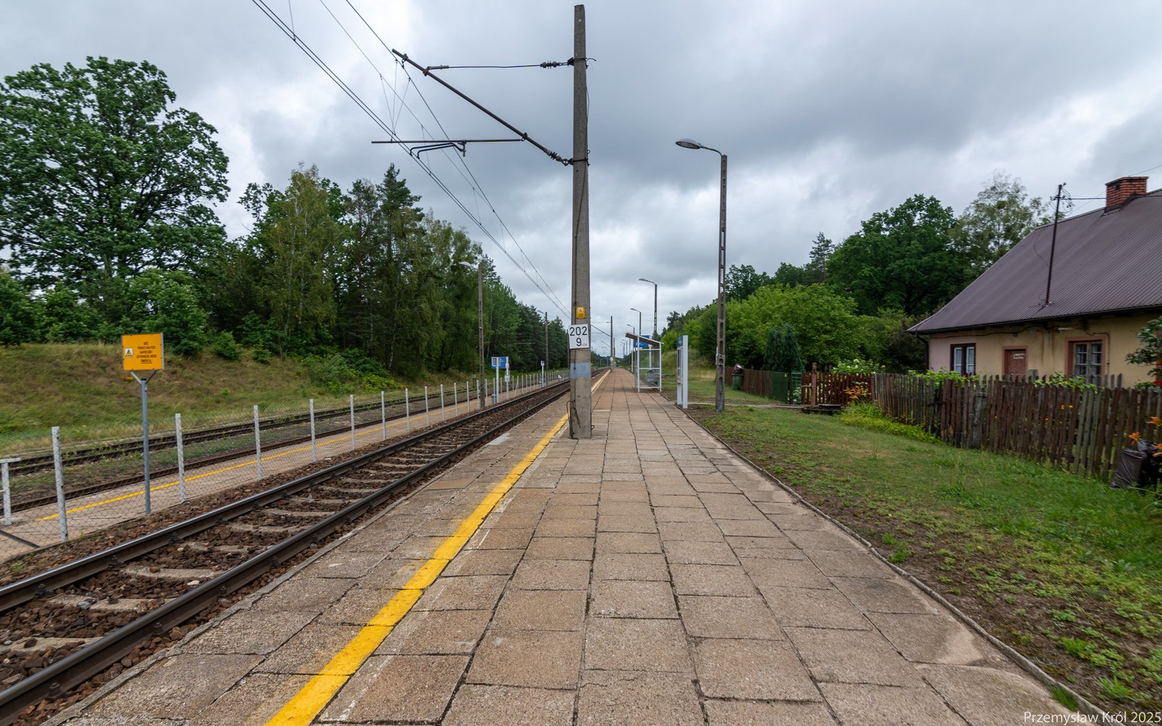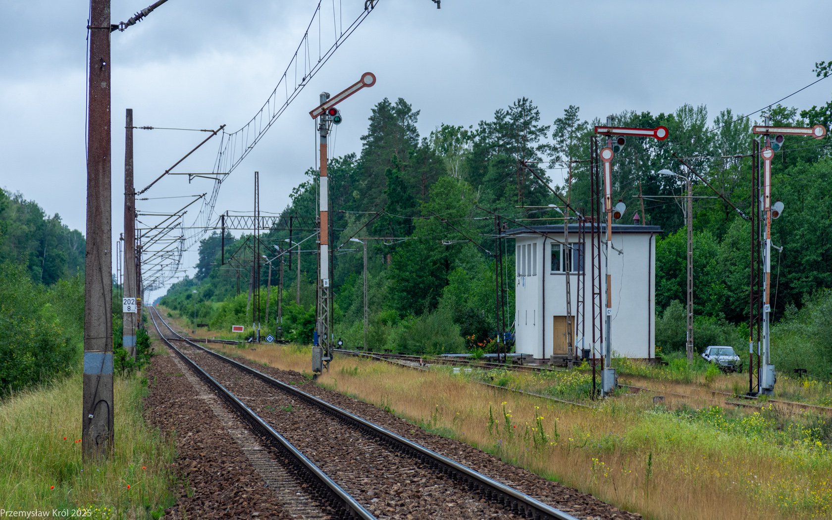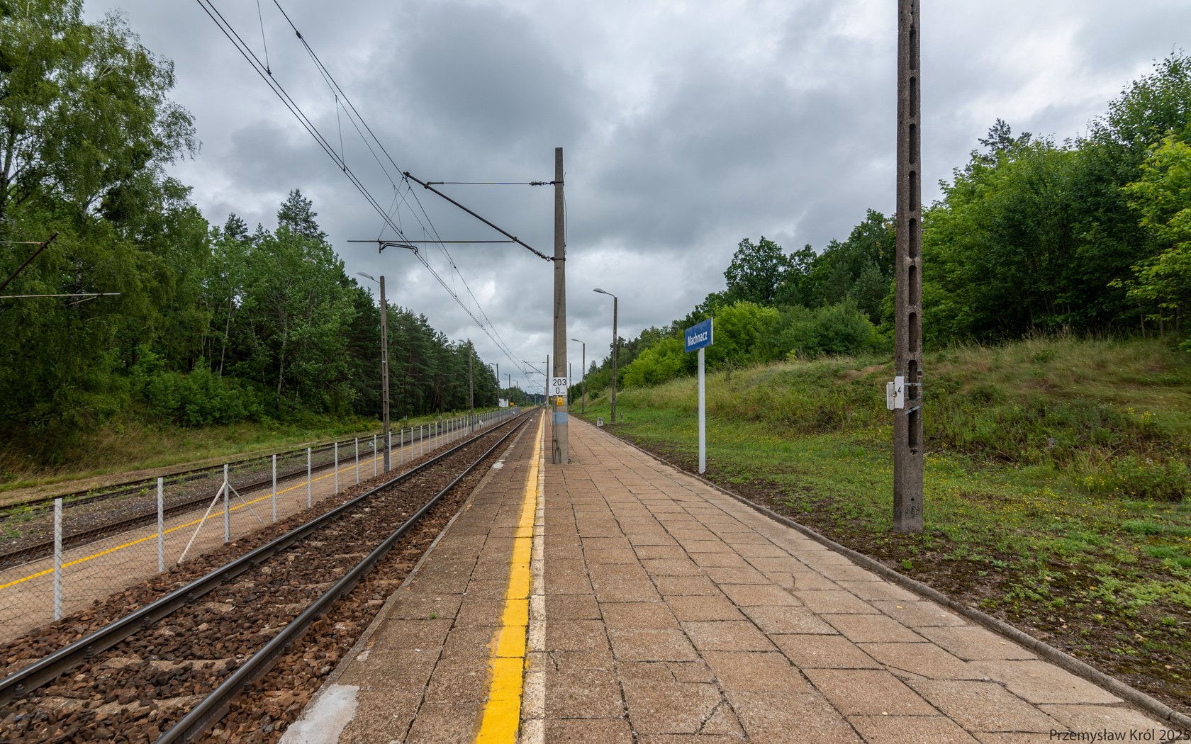 Słupek hektametrowy wskazuje dokładnie 203 kilometrów kolejowych od początkowego punktu linii numer 6 (stacja Zielonka).