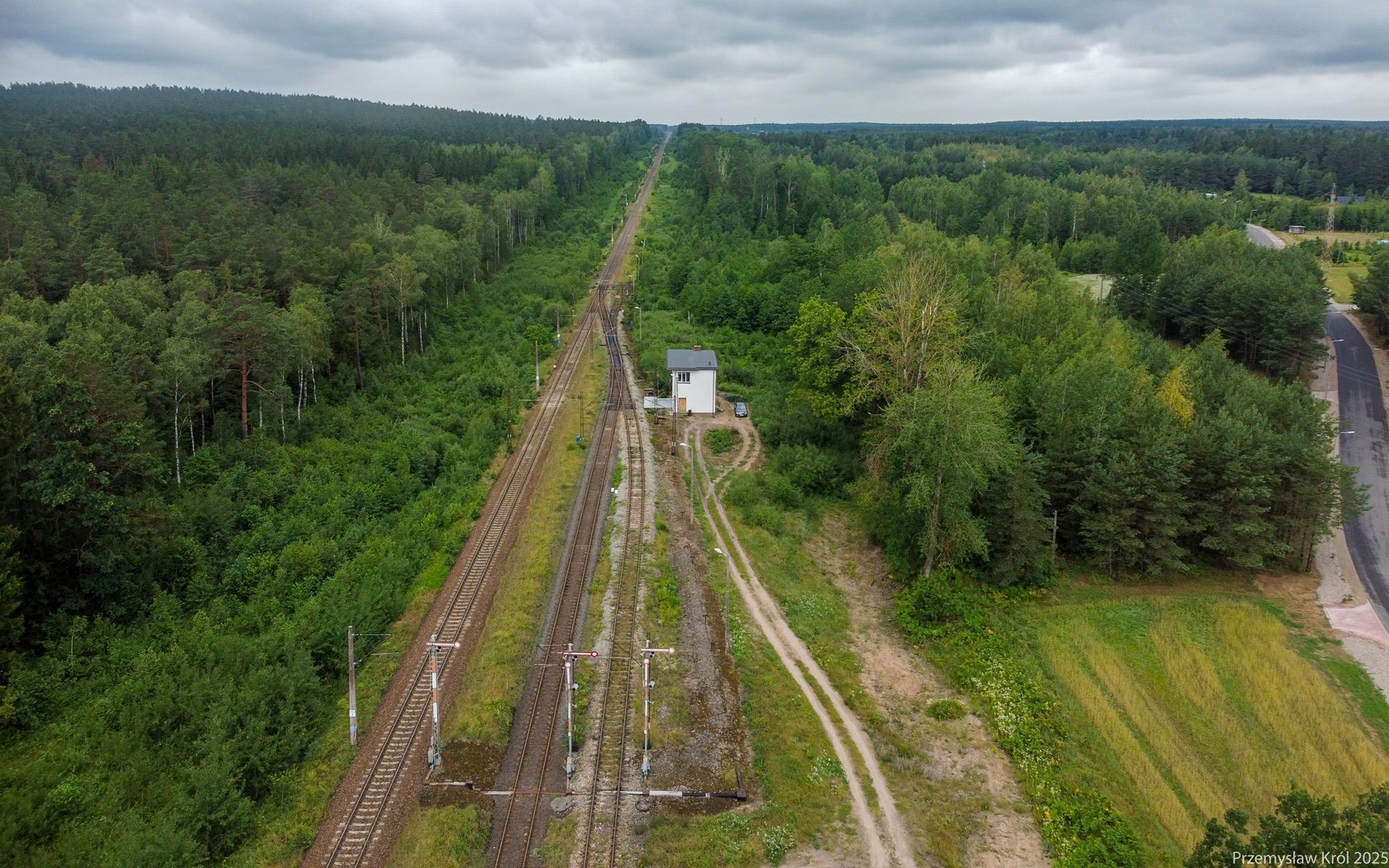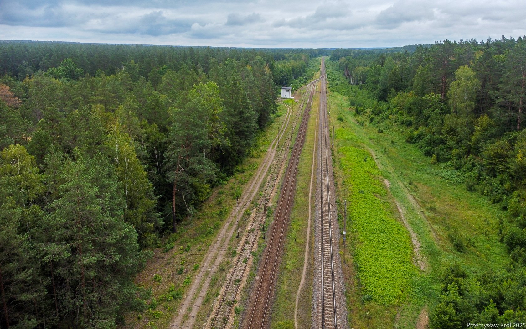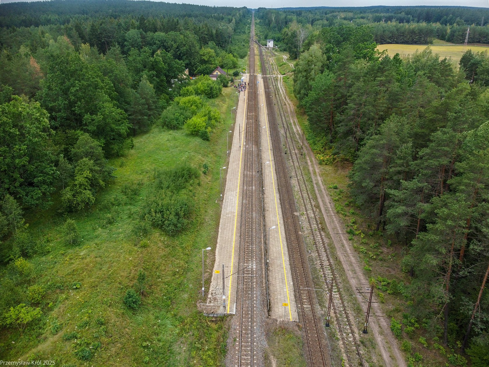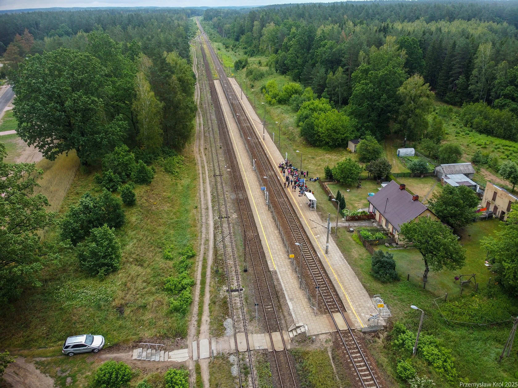Widok na perony stacji z powietrza od strony przejścia przed torami, na stacji koloniści oczekujący na pociąg do Białegostoku, i dziwią się skąd wziął się ten dron co lata.