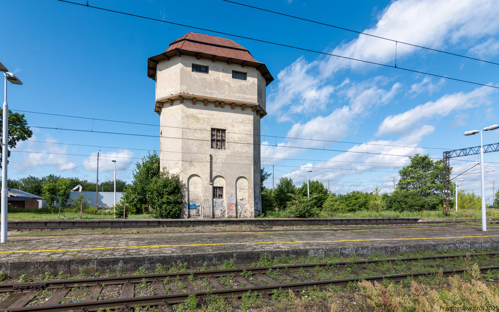 Kolejowa wieża ciśnień w Grajewie przy peronach stacji.