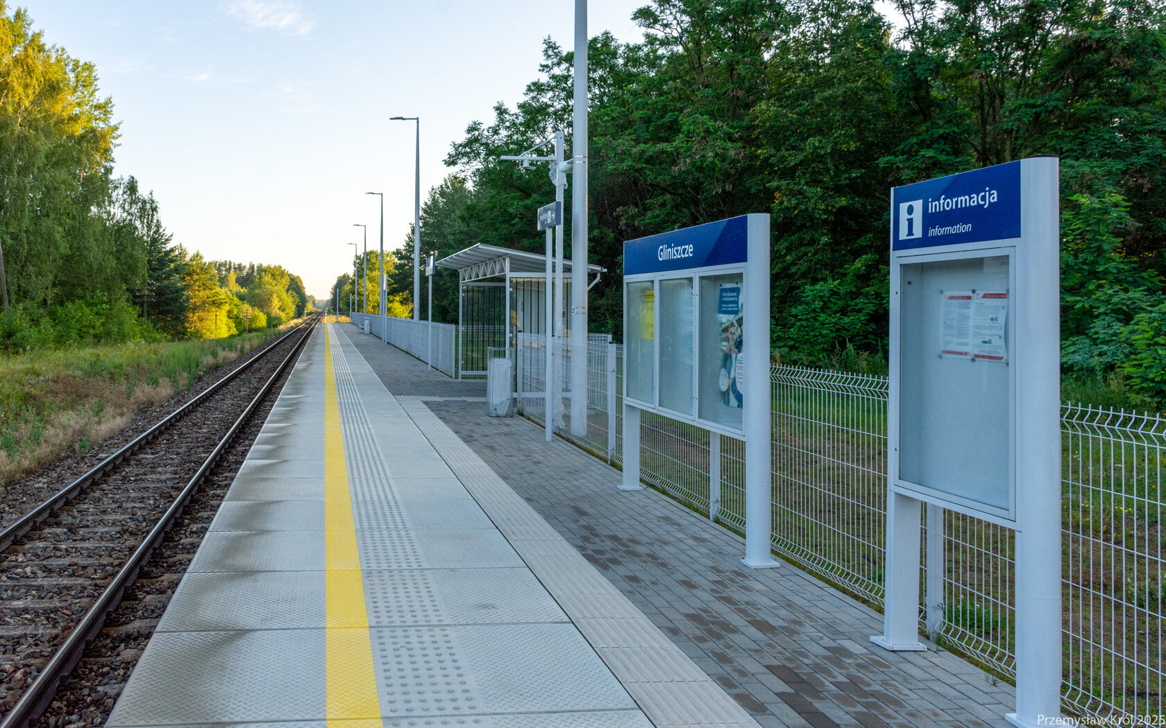 Za wiatą jest tablica kierunkowa wskazująca kierunki jazdy pociągów, ponad za torami jest tablica mówiąca o środkach finansowania modernizacji przystanku.
