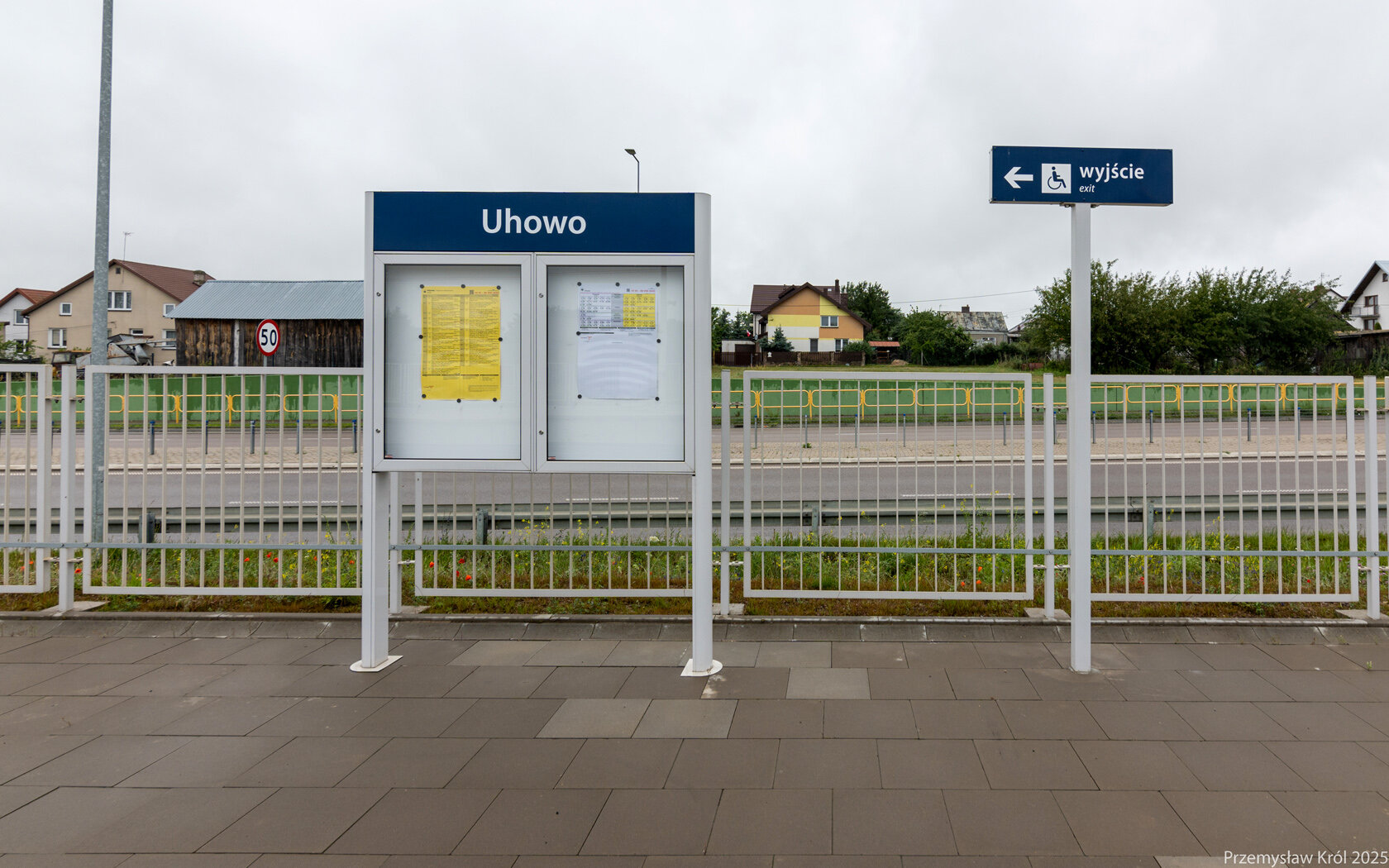 Na końcu peronu ustawiono tabliczkę kierunkową wskazującą kierunek opuszczenia platformy.