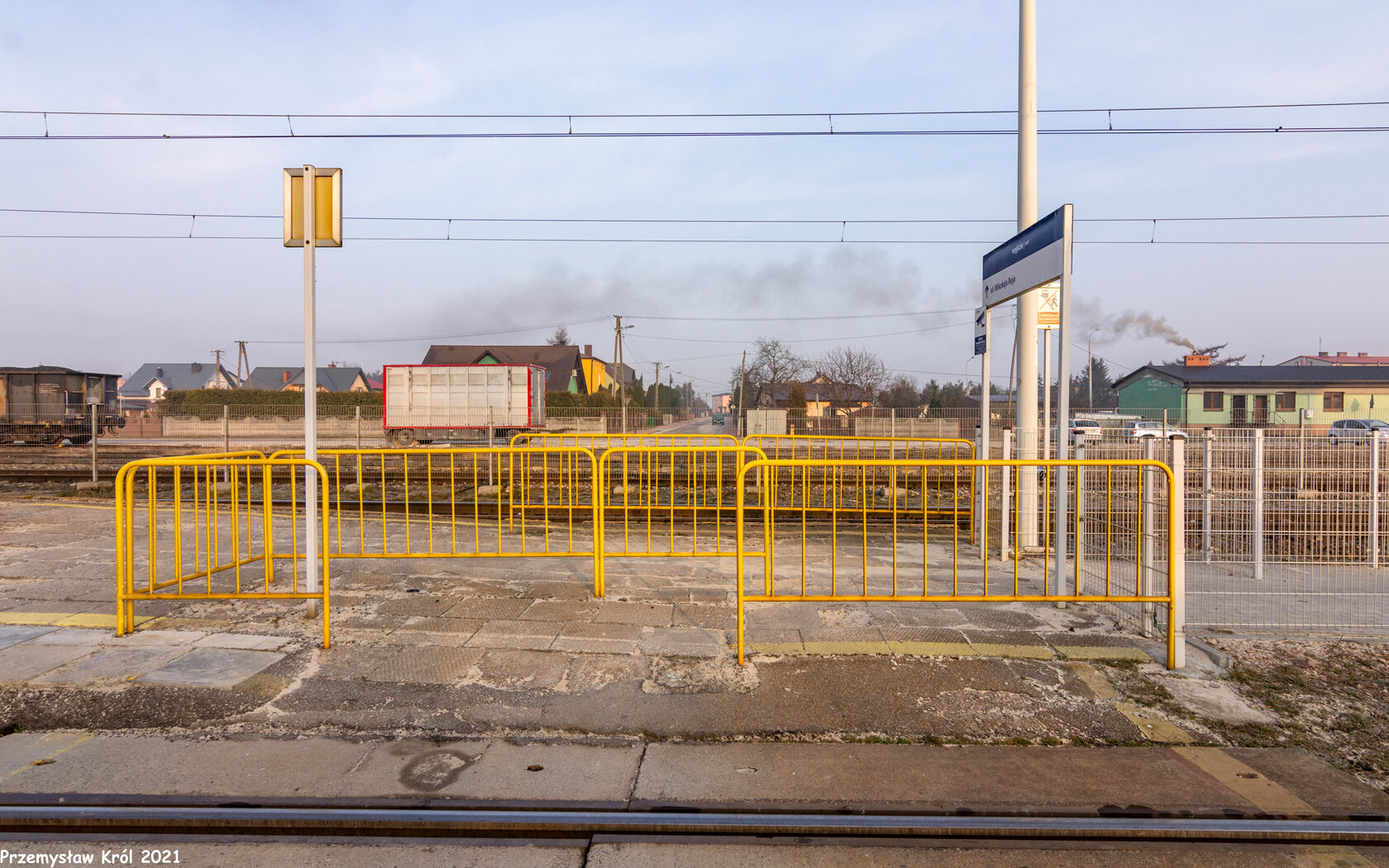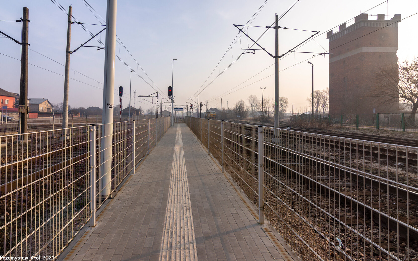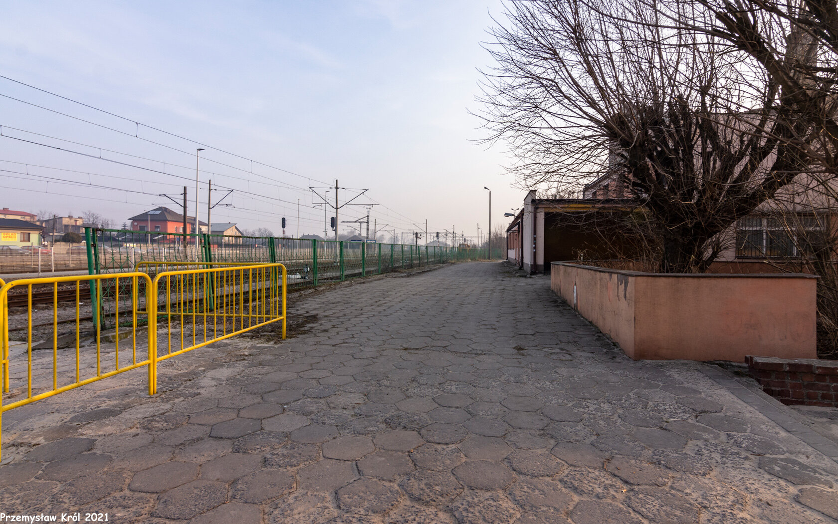 Dojście do przejścia przez tory (od torów i szybko przejeżdżających tędy pociągów pasażer jest oddzielony wysokim płotem).