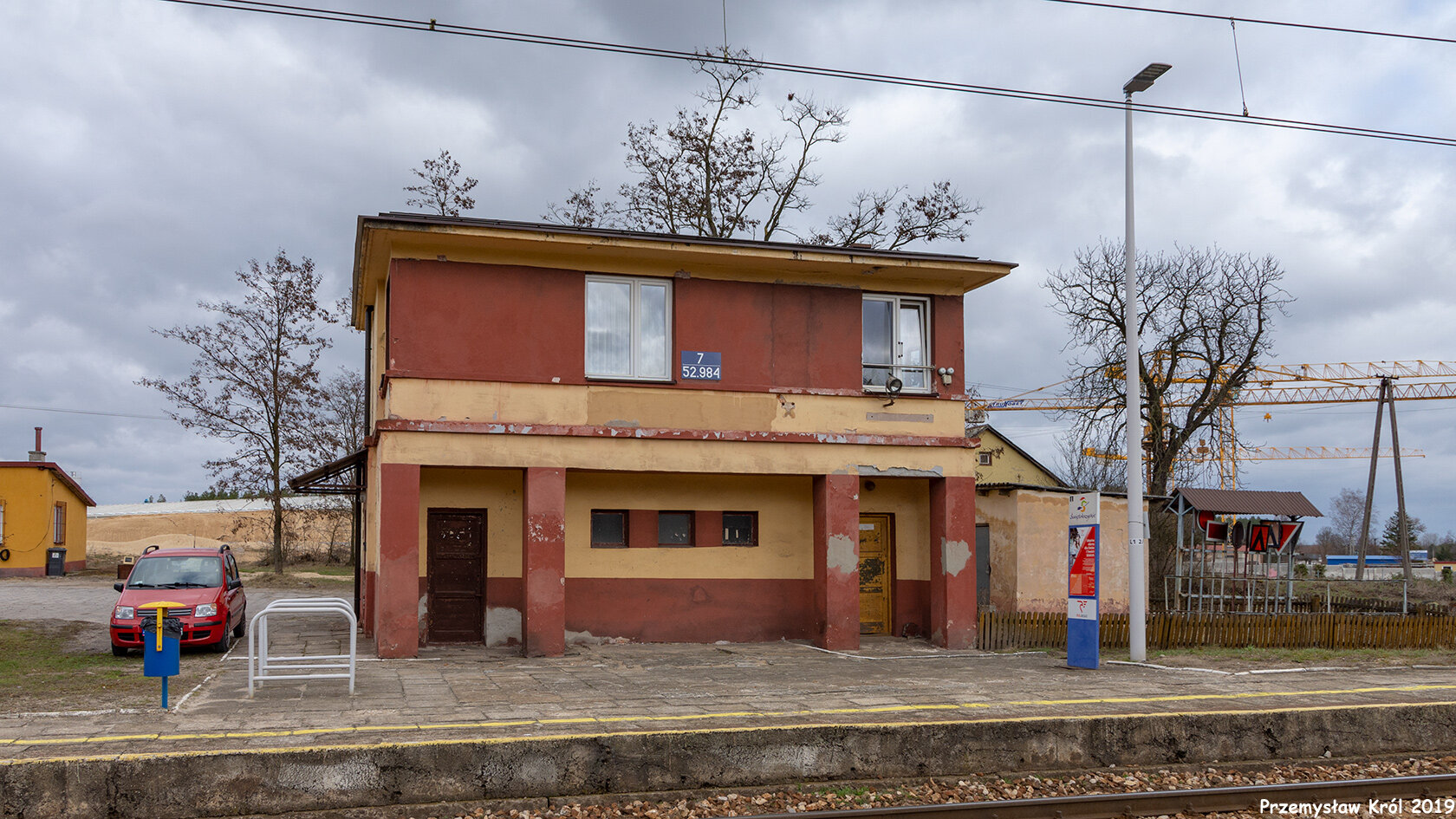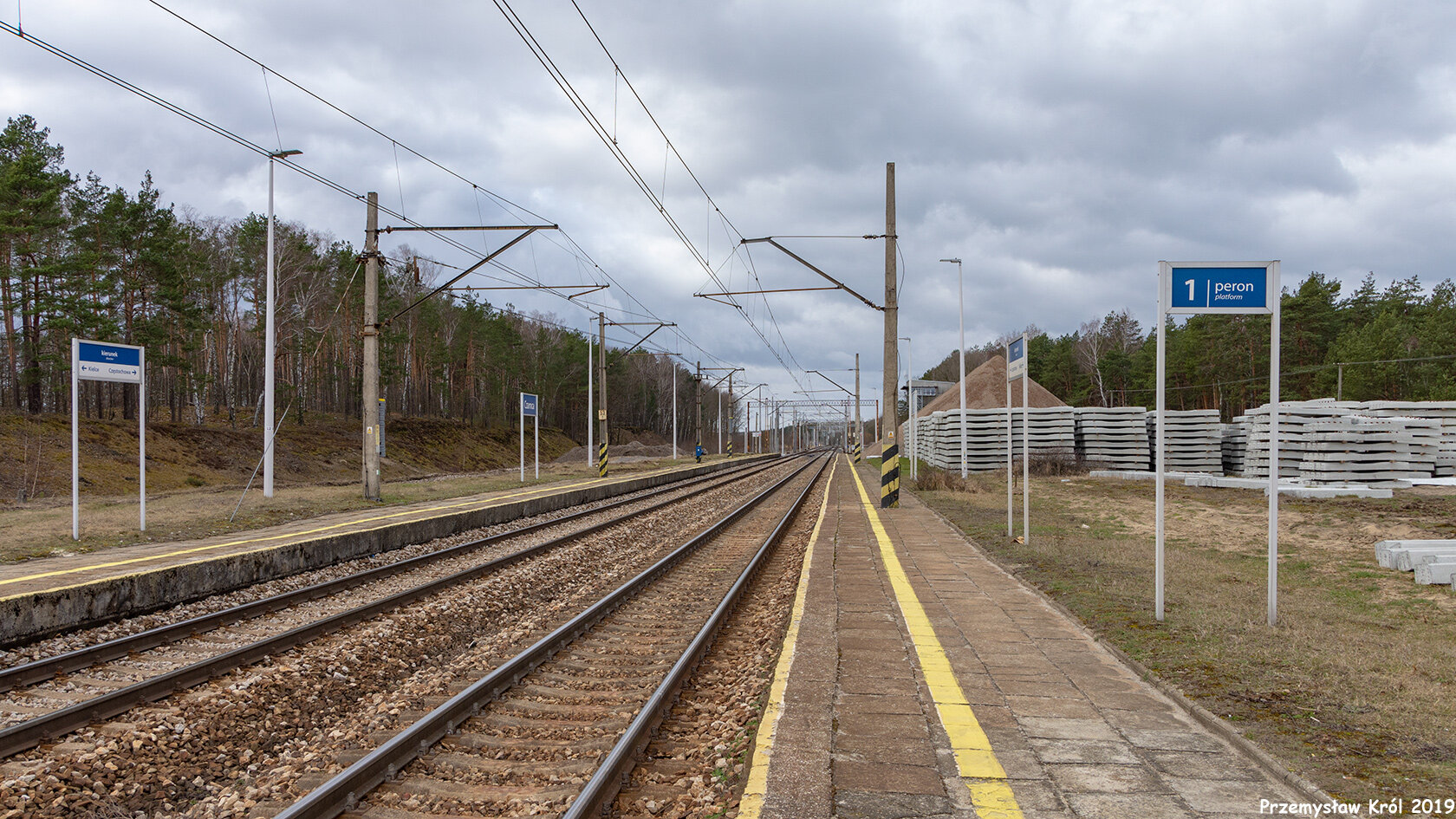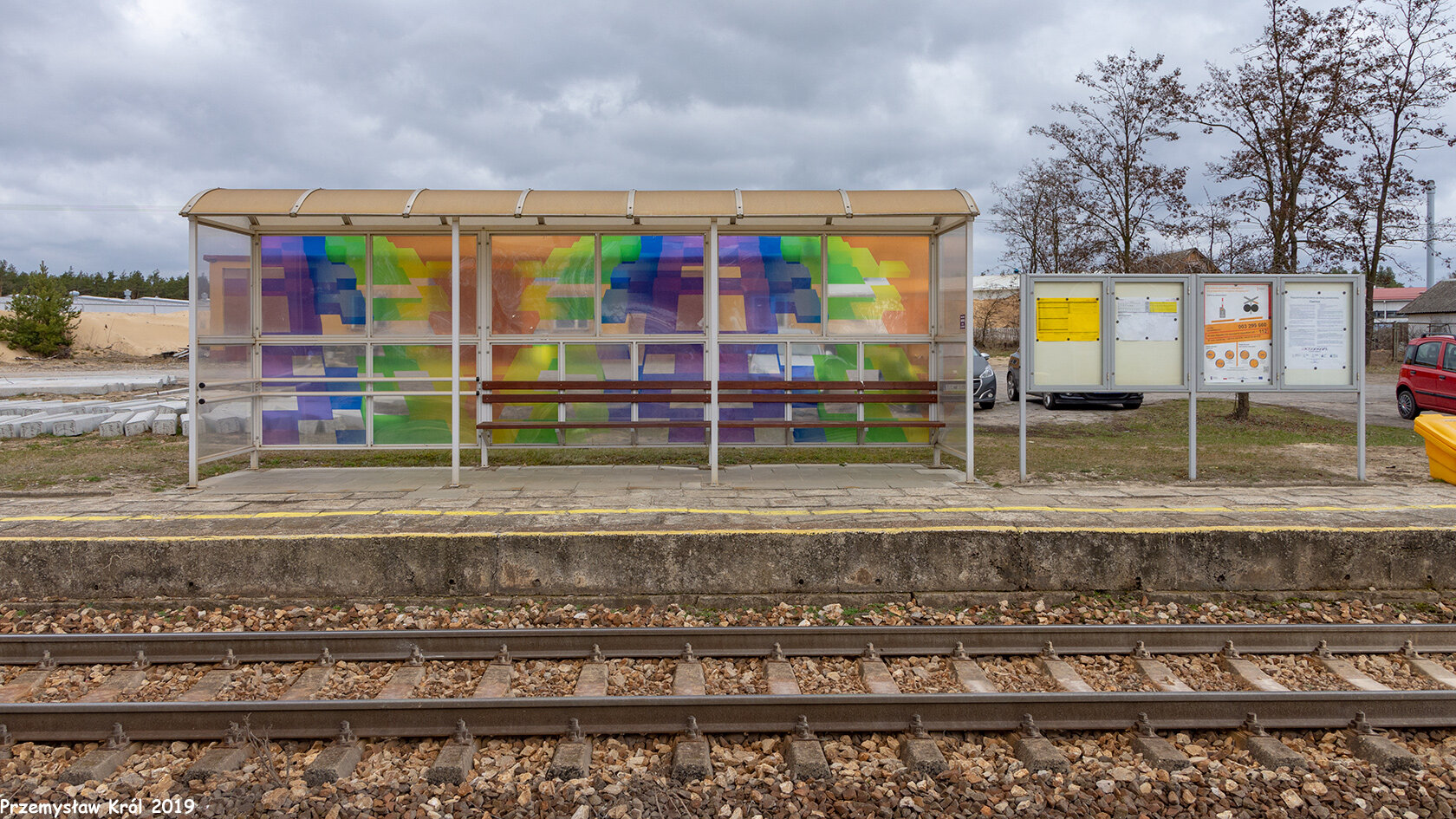 Wiata i gabloty z informacjami pasażerskimi na pierwszym peronie stacji.