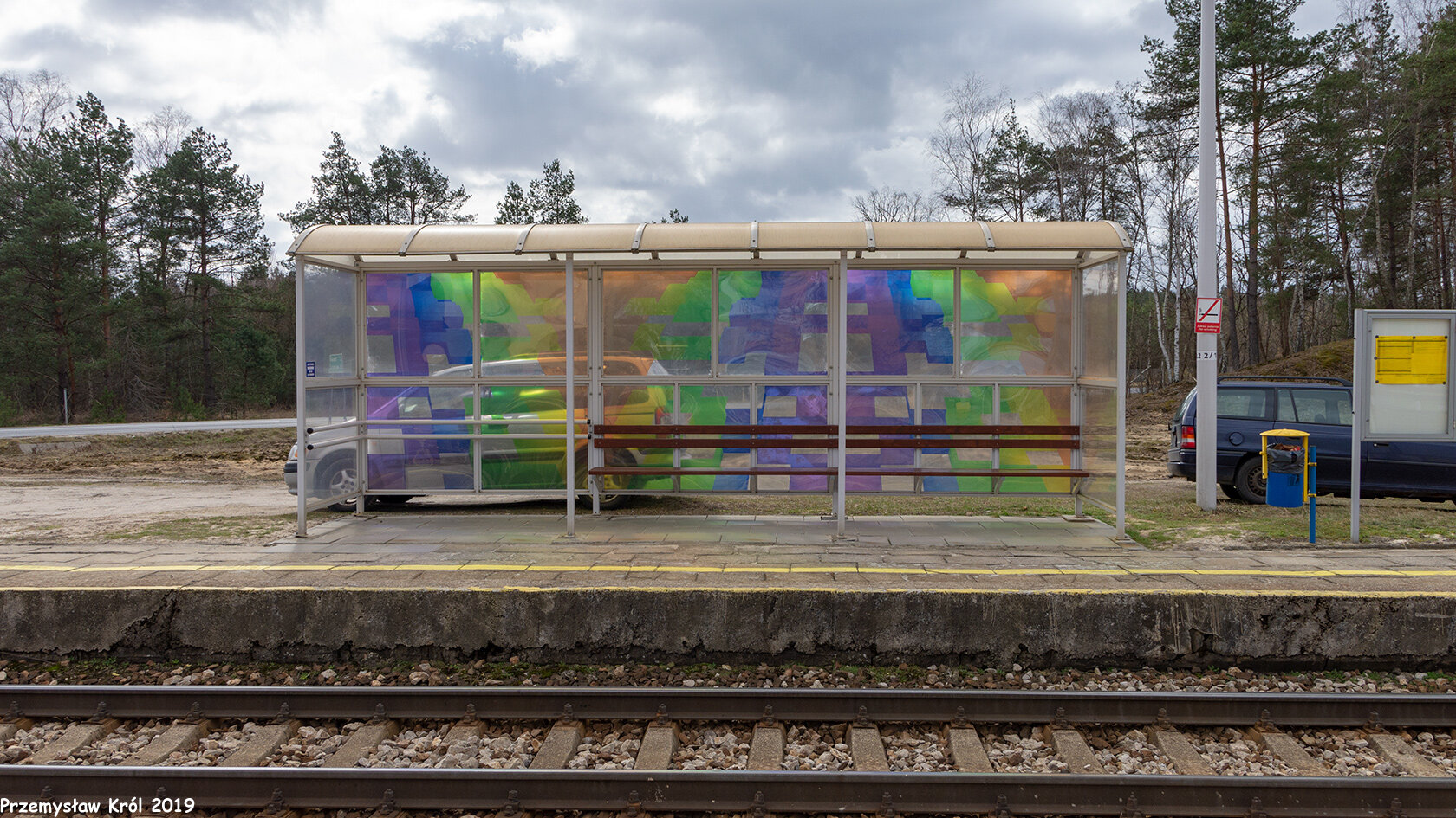 Kolorowa wiata na drugim peronie, po remoncie przystanku ta wiata została zastąpiona inną konstrukcją.