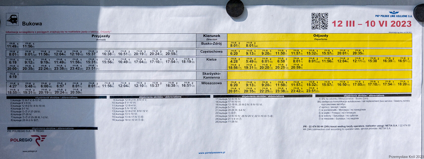 Rozkład jazdy, najwięcej pociągów jeździ pomiędzy Kielcami, a Włoszczową.
