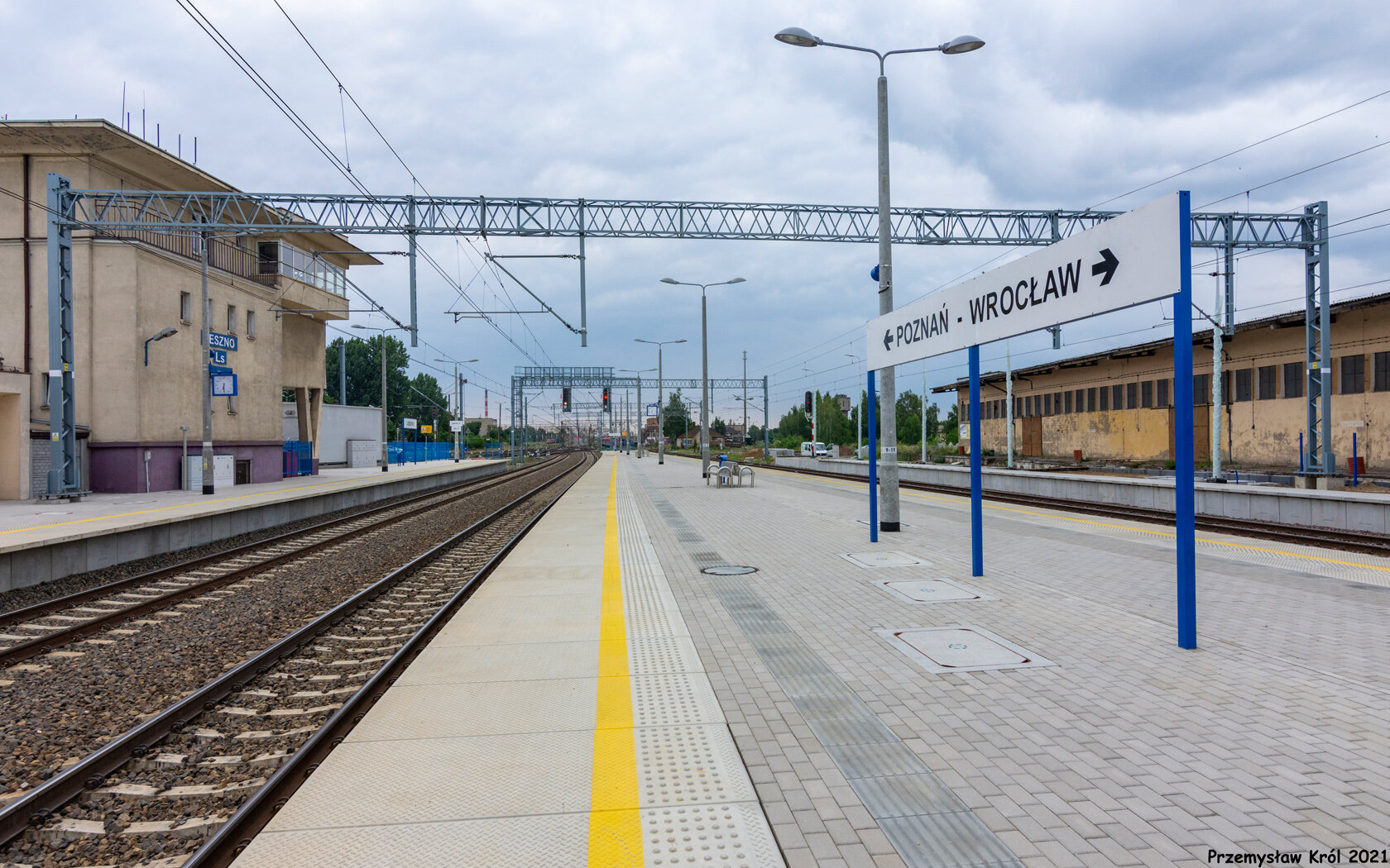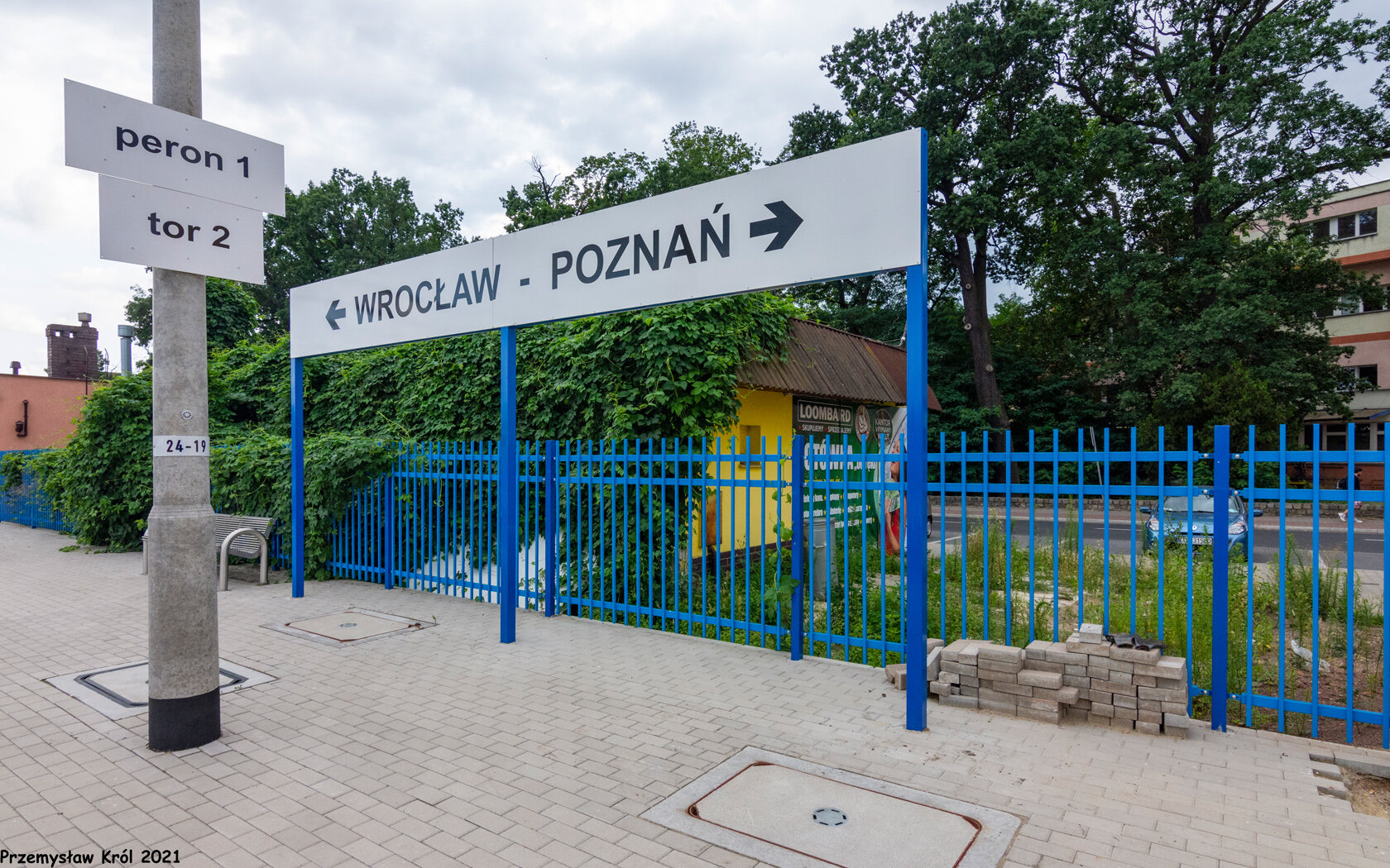 Peron numer 1 i bardzo duże tablice kierunkowe wskazujące kierunki jazdy pociągów, Wrocław i Poznań (jako te najważniejsze) ponad to można dojechać jeszcze do Głogowa, Krotoszyna i Wolsztyna.
