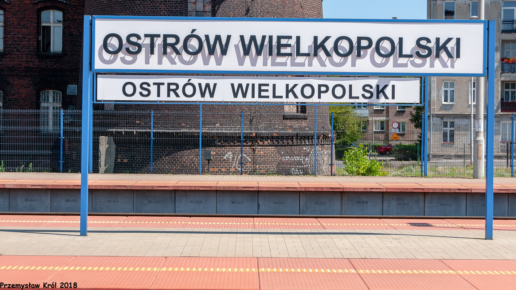 Ujęcie na dwie tablice z nazwą stacji, na pierwszym planie tablica z trzeciego peronu na kolejnym peron 2.