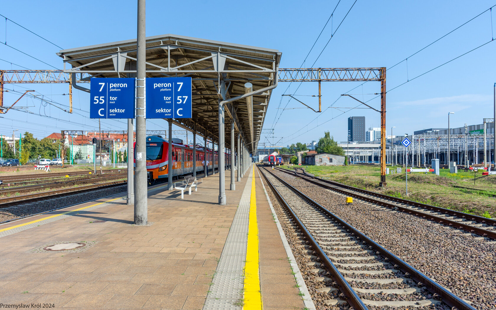 Peron numer 7 ma dwie krawędzie peronowe przy torach 55 i 57.