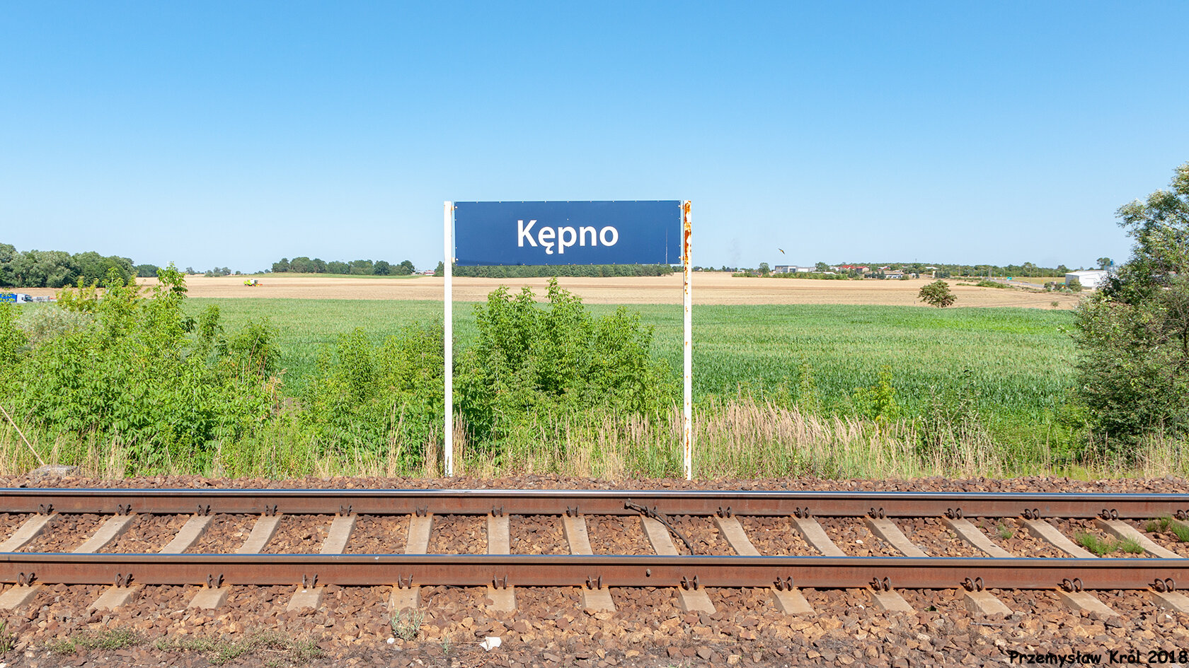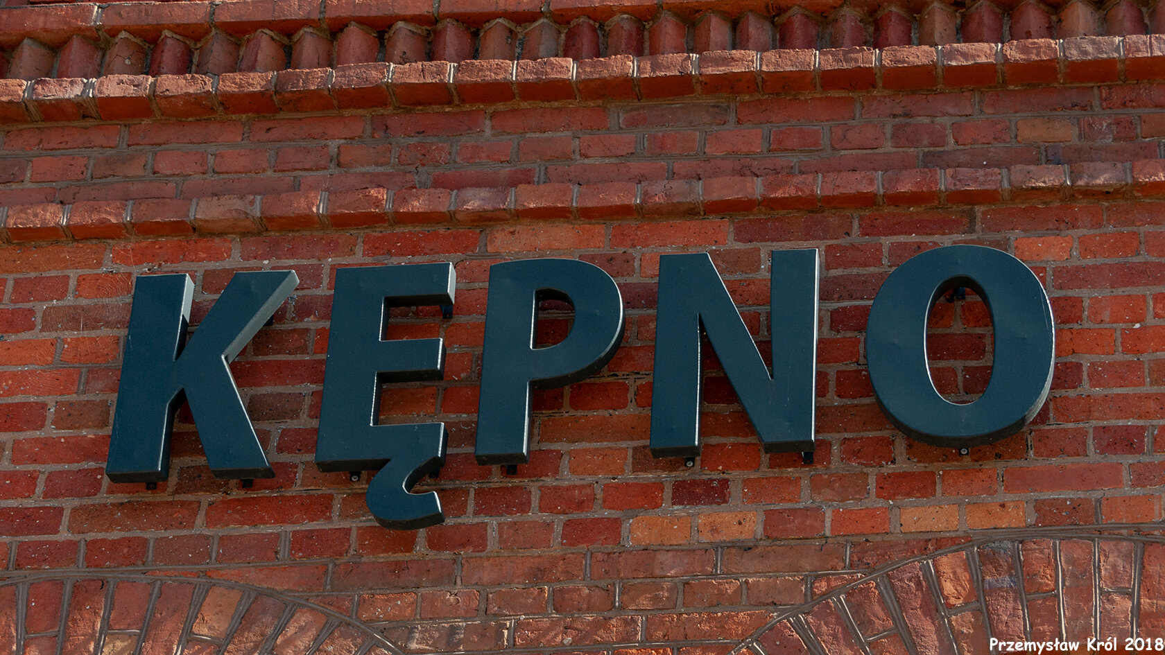 Wytłoczony napis "KĘPNO" na budynku dworca kolejowego.