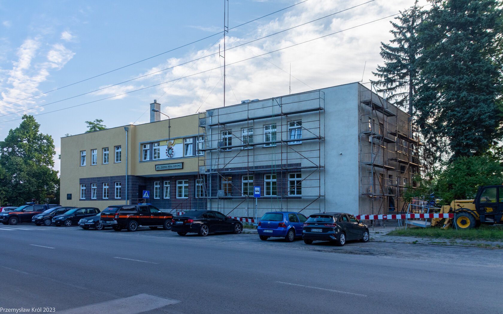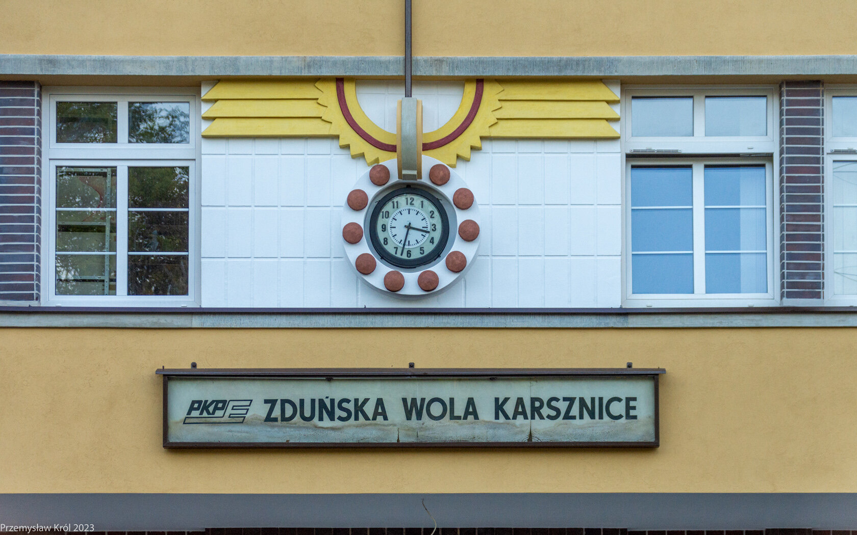Zegar na budynku dworca został odnowiony, stary napis PKPE ZDUŃSKA WOLA KARSZNICE ... już nie.