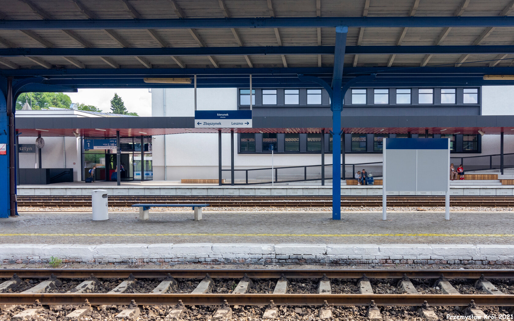 Wiszące na drugim peronie kierunki jazdy. Wskazują jazdę na Leszno i Zbąszynek.