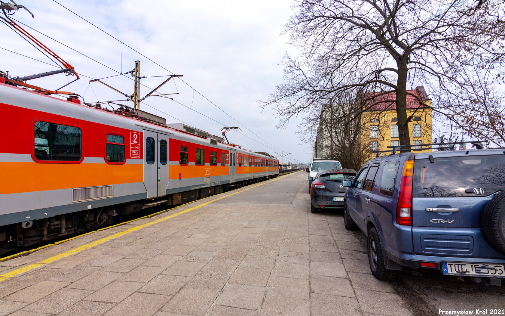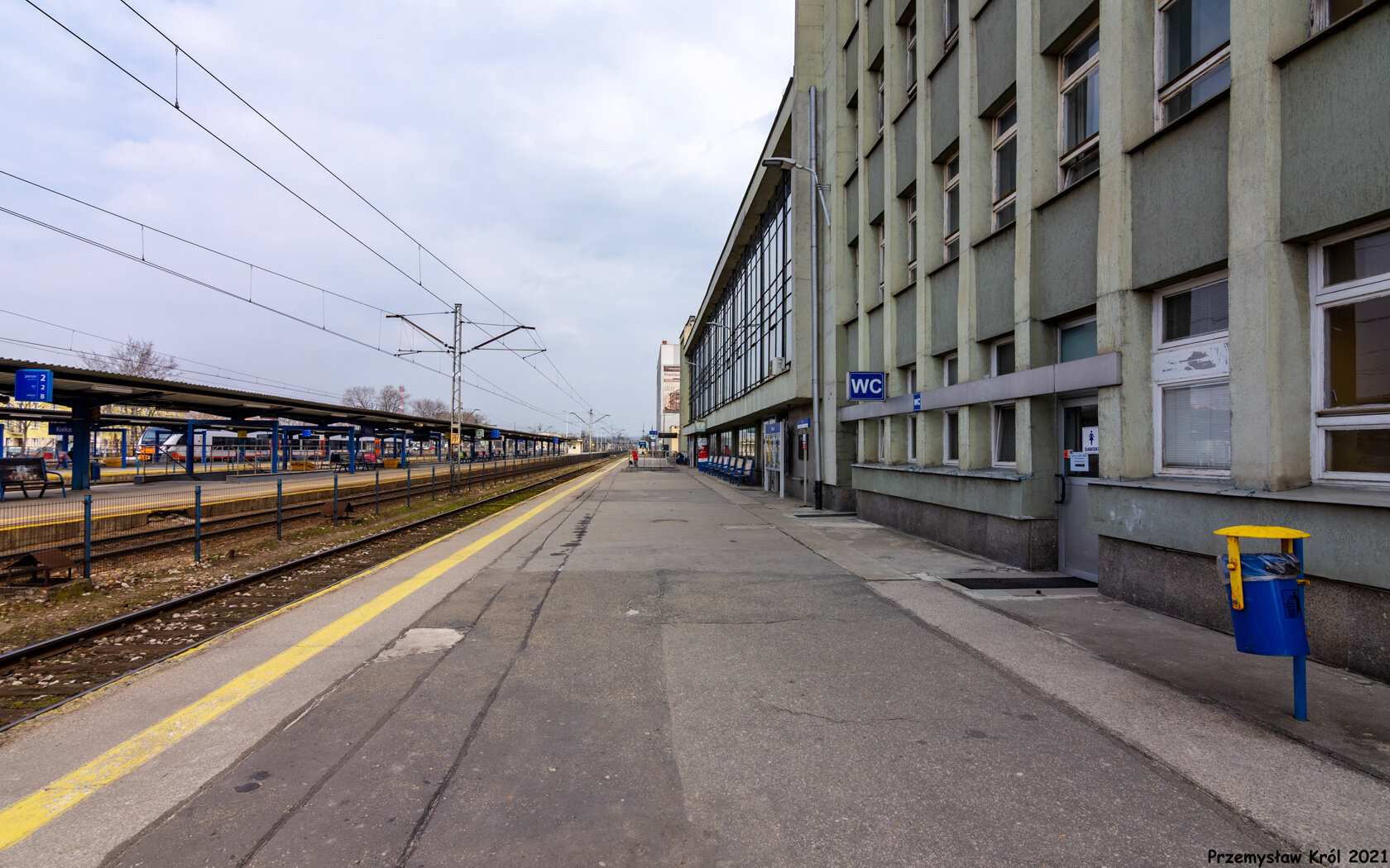 Pierwszy peron stacji od południowej strony, stoi tu jednostka, która szykuje się do podjęcia kursu w stronę Skarżyska-Kamiennej.