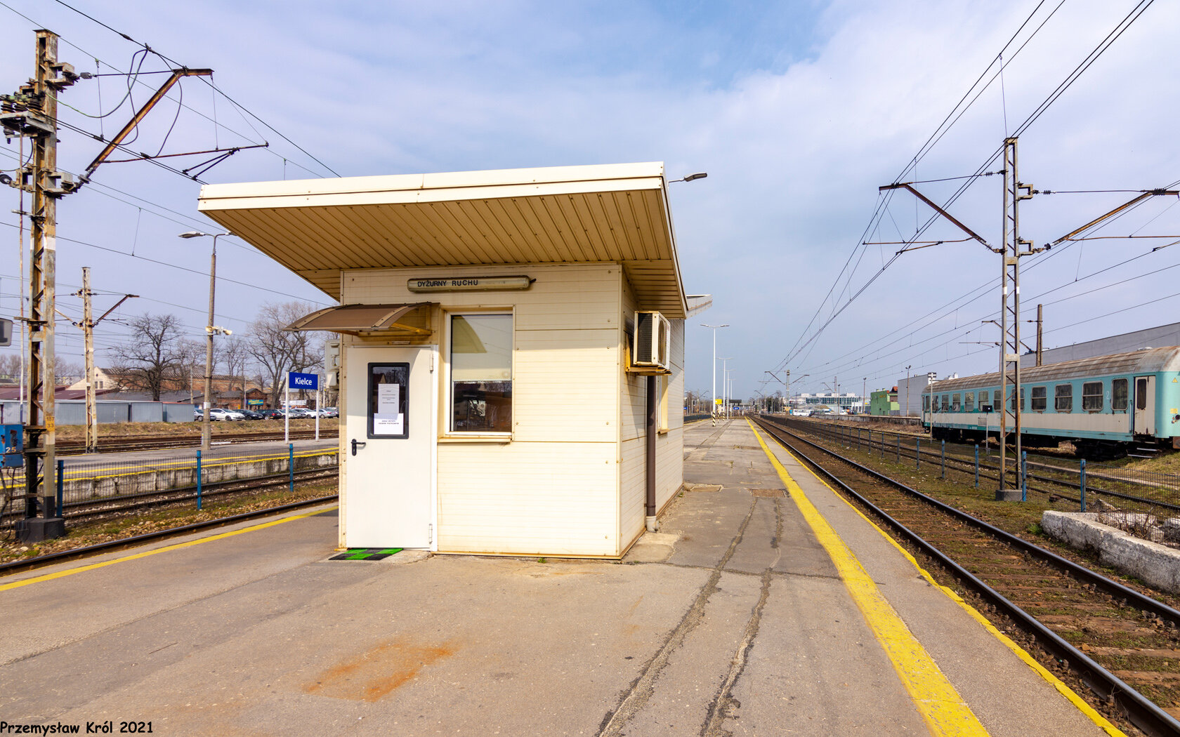 Budynek dyżurnego ruchu peronowego na drugim peronie stacji w Kielcach.