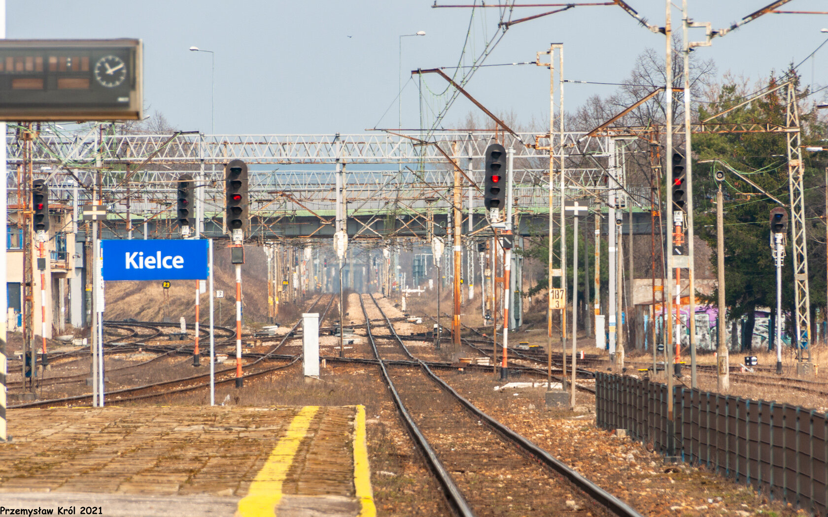 Widok z końca peronu w stronę północną na wyloty w stronę Włoszczowa (w lewo LK61) i Skarżyska-Kamiennej (na wprost LK8)