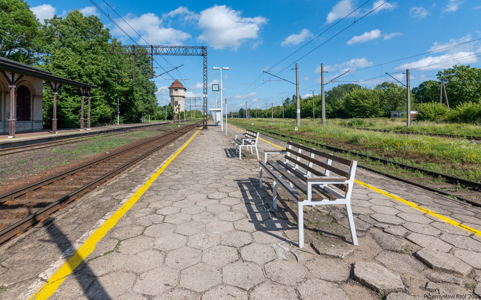 Ławki na peronie dla pasażerów oczekujących na pociąg.