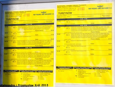 Jeszcze w zeszłym roku koleje wielkopolski i zachodniopomorskie korzystały z pałąków tego typu jak ten zielony. Od roku 2013 gdy rozkłady ma obowiązek wieszać PLK przestano wykorzystywać tego typu konstrukcje.