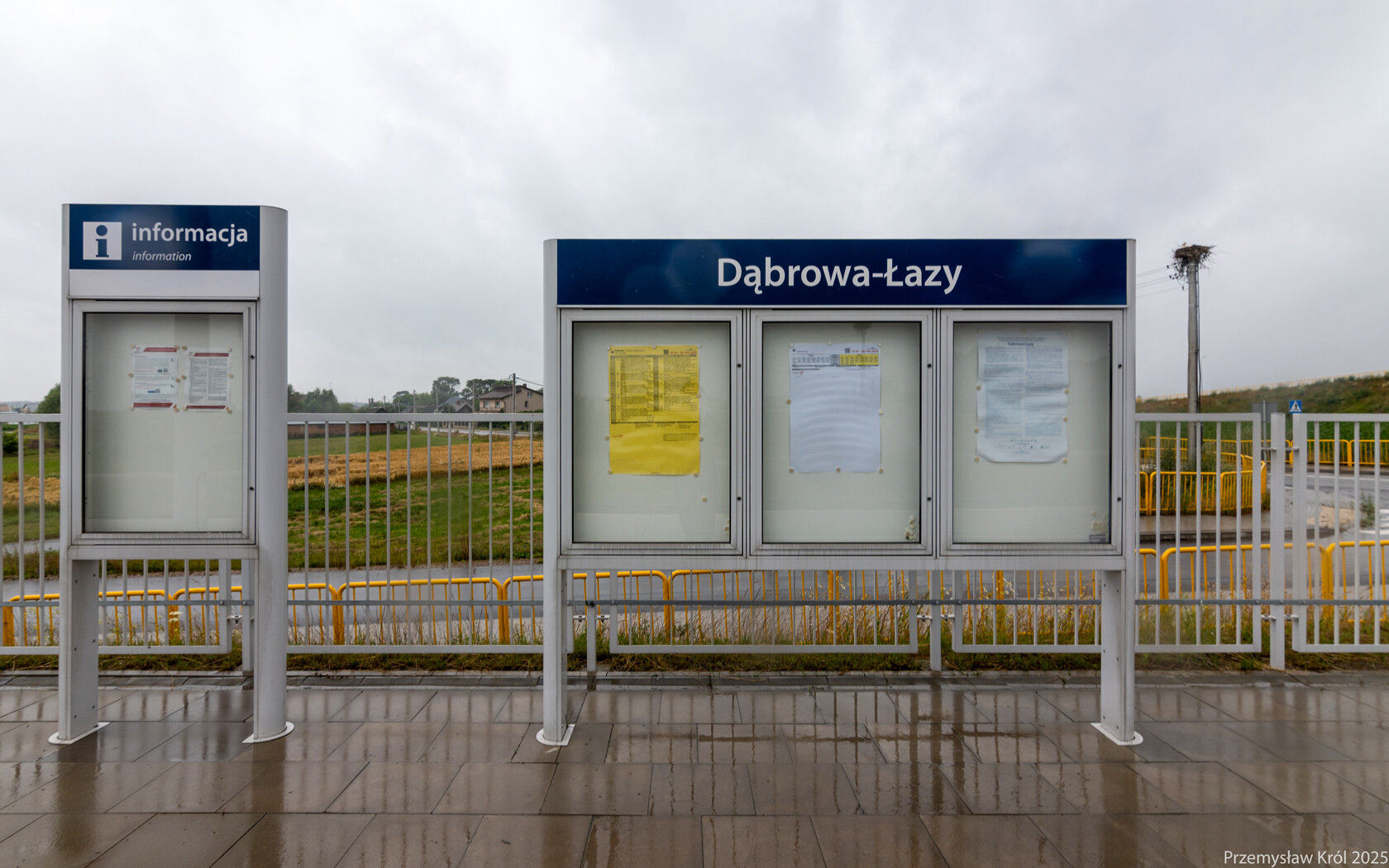 Gabloty informacyjne na pierwszym peronie (ujęcie w kierunku wyjścia z pierwszego peronu).