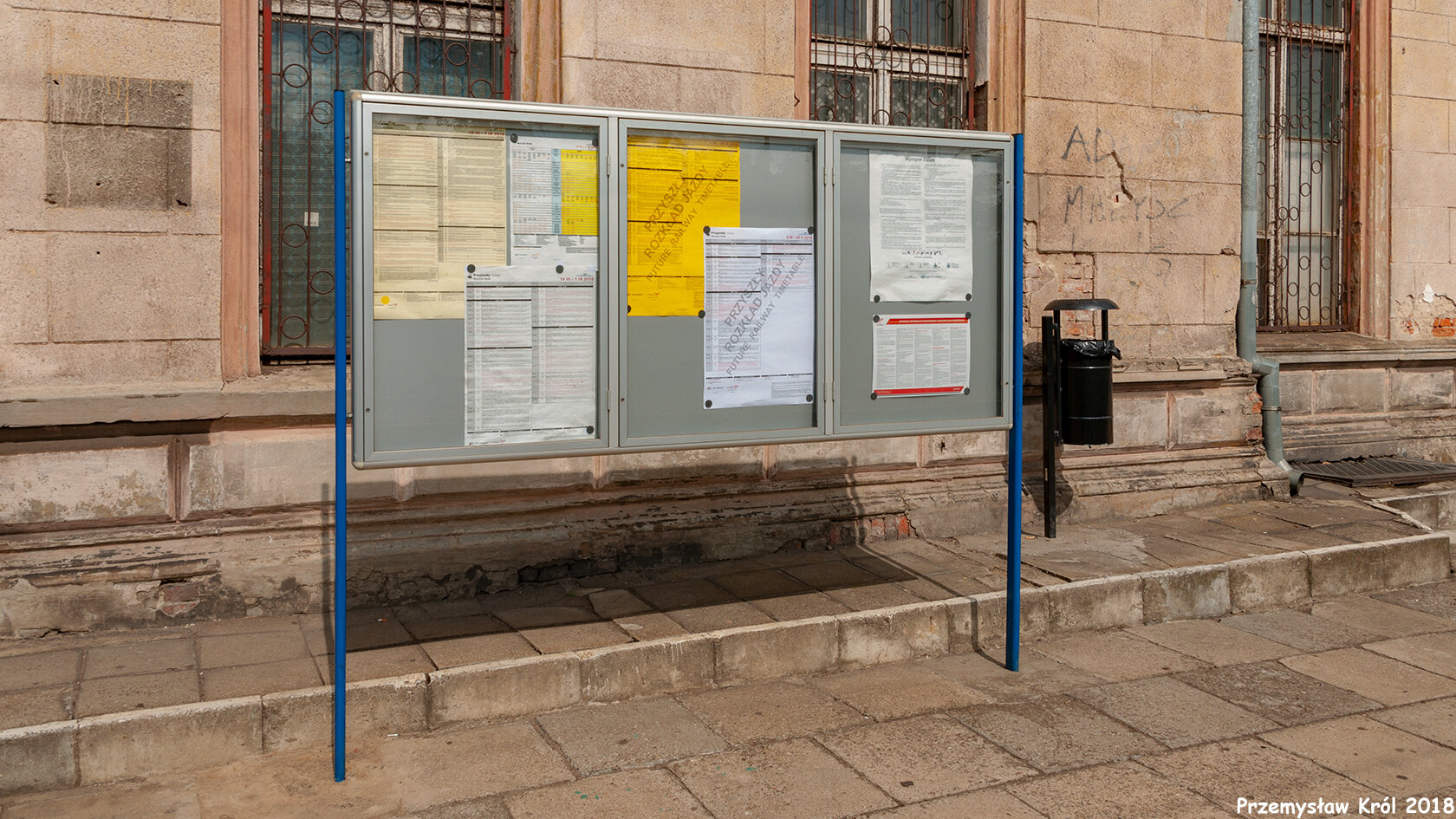 Wnętrze dworca kolejowego w Pile i informacja elektroniczna dla podróżnych.