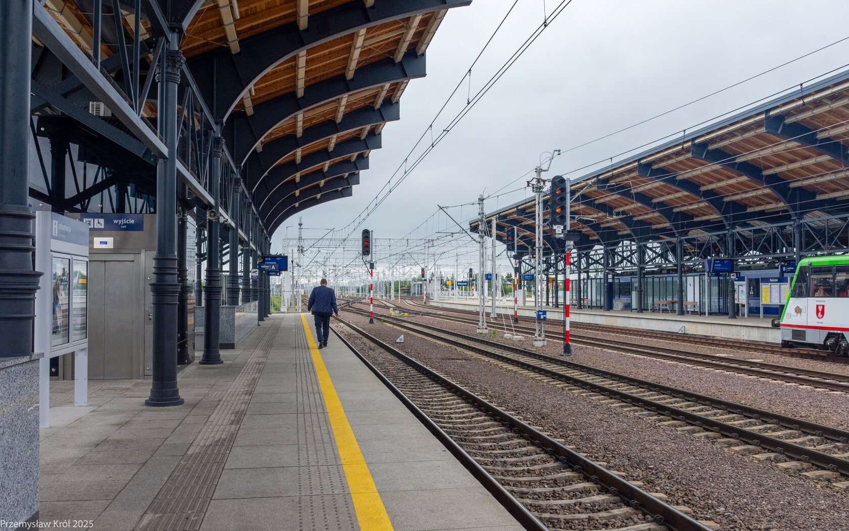 Szeroki, długi i pusty peron numer 1 dla pociągów jadących na południe polski w stronę Warszawy.