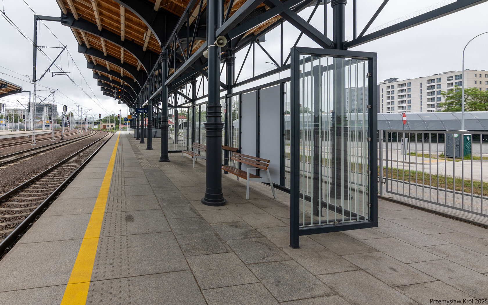 Ujęcie na pustą dwustronną wiatę na drugim peronie stacji.