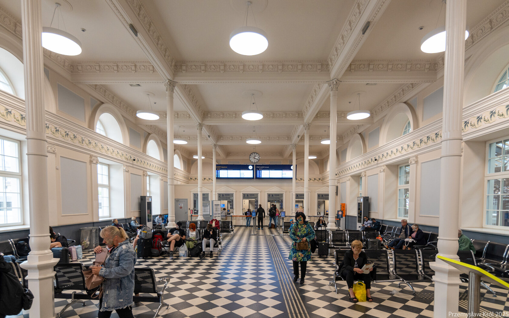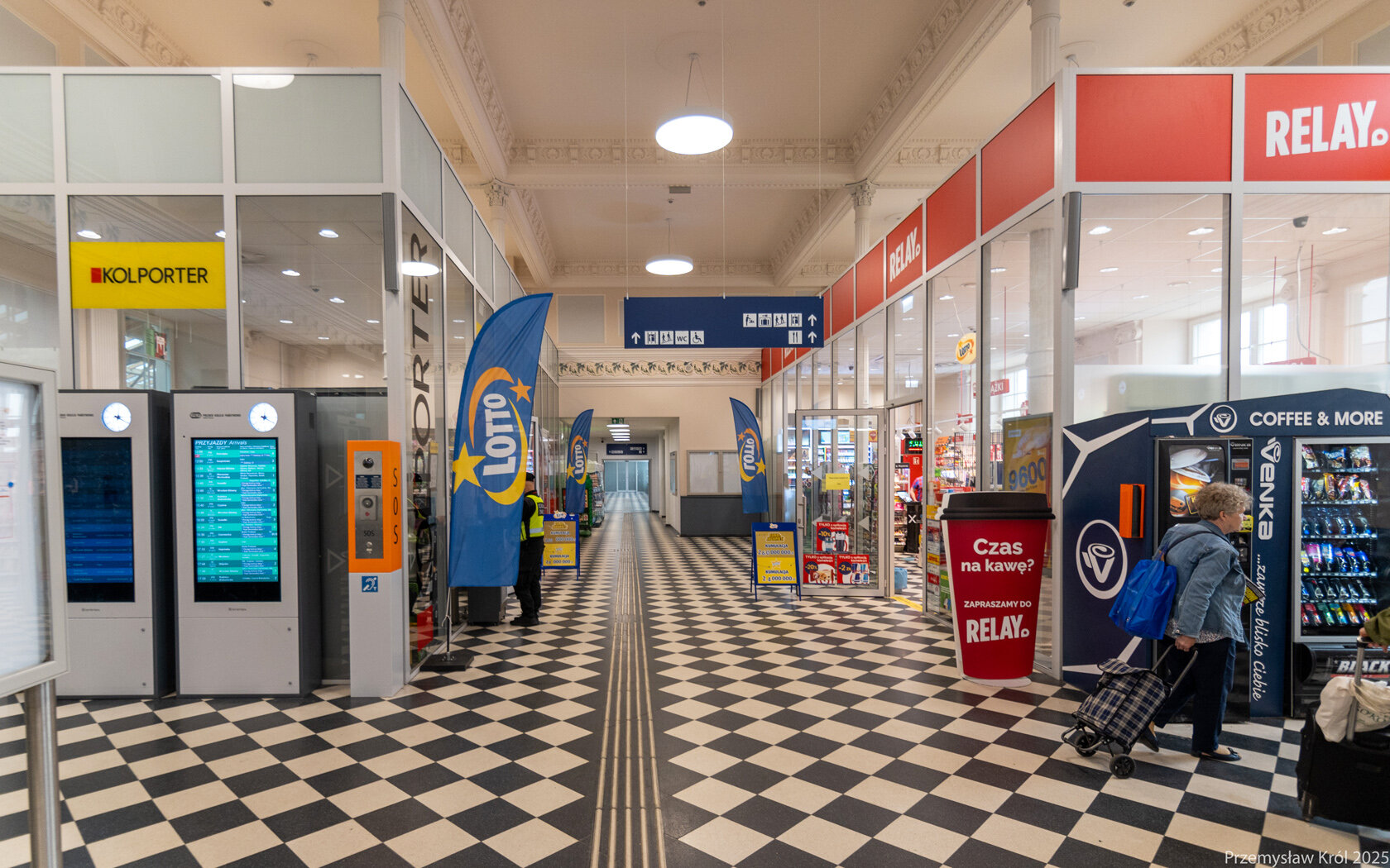 Główna poczekalnia wewnątrz dworca w Białymstoku w tyle kasy biletowe.
