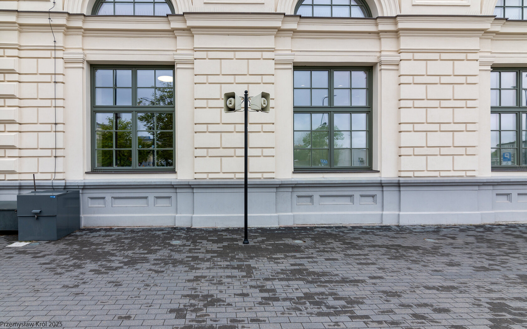 Czegoś takiego jeszcze nie widziałem, system nagłośnienia przy budynku dworca.