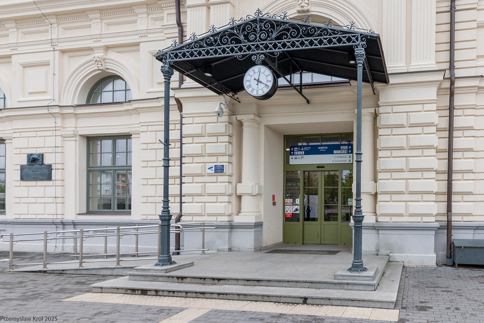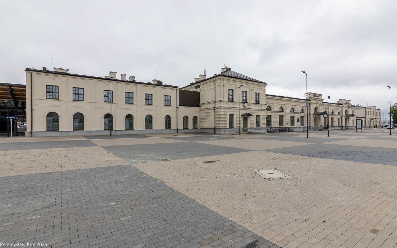 Imponujący budynek dworca kolejowego w Białymstoku od strony miasta.