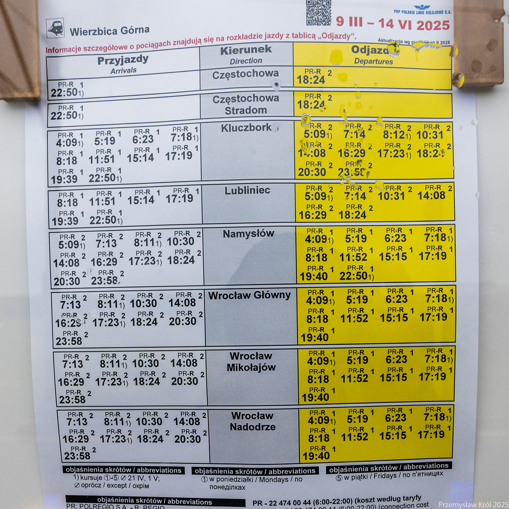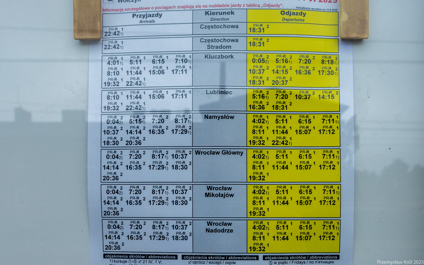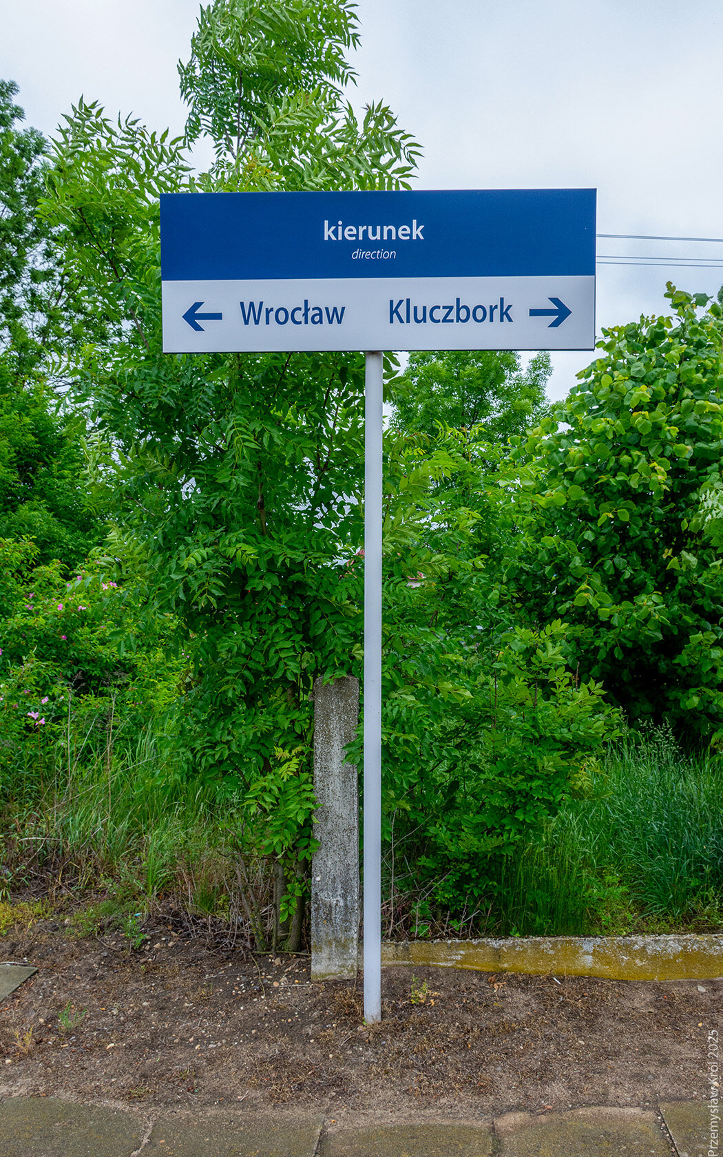 Tablica kierunków jazdy wskazuje dwa główne kierunki w jakich można podróżować. Na wschód dojedziemy głównie do Kluczborka stamtąd możemy przesiąść się i jechać dalej. Z kolei kierunek zachodni Wrocław to chyba lekkie nadużycie, po drodze jest stacja węzłowa w Oleśnicy, z której można pojechać w inne rejony kraju.