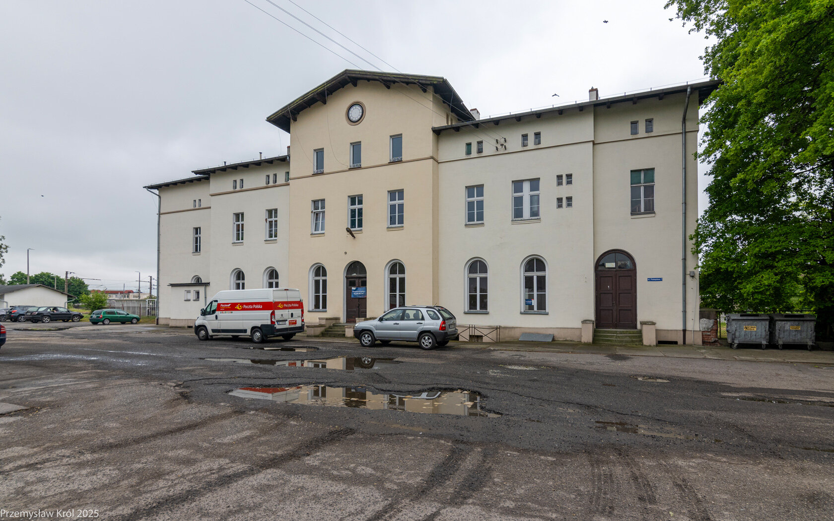 Ujęcie na budynek dworca od strony brukowanego podjazdu.