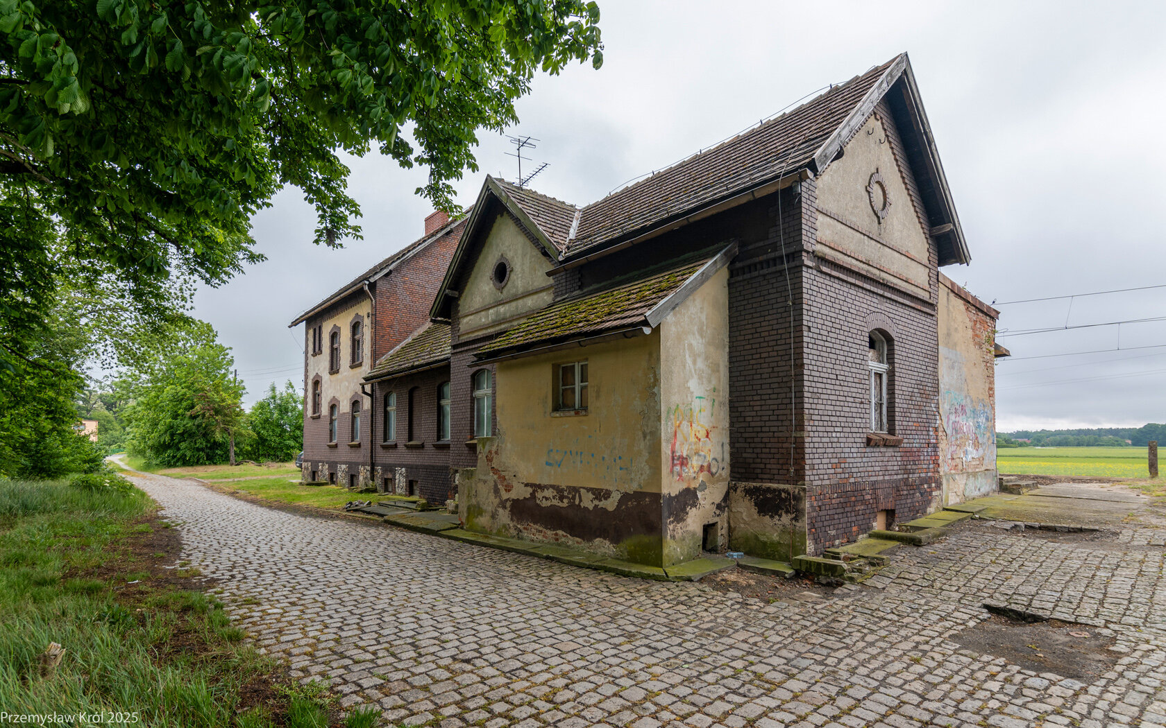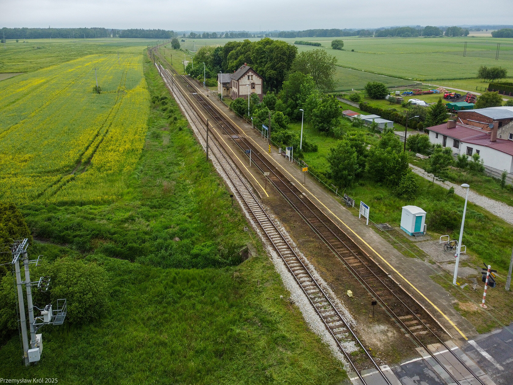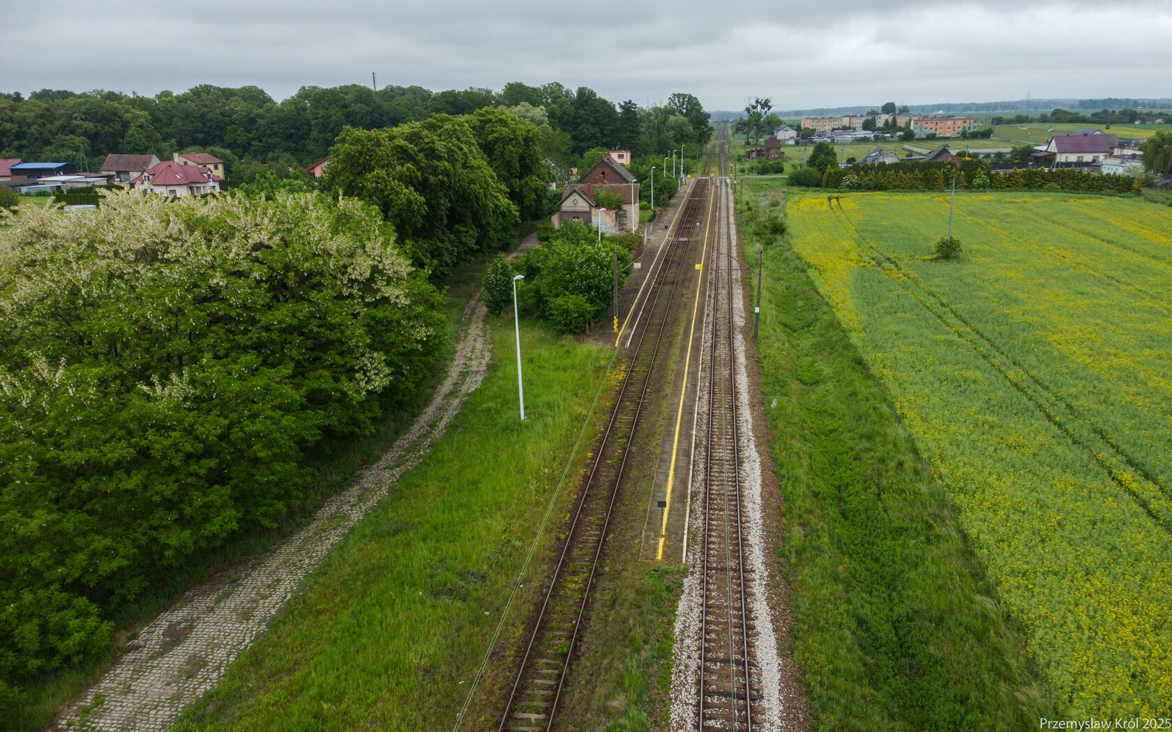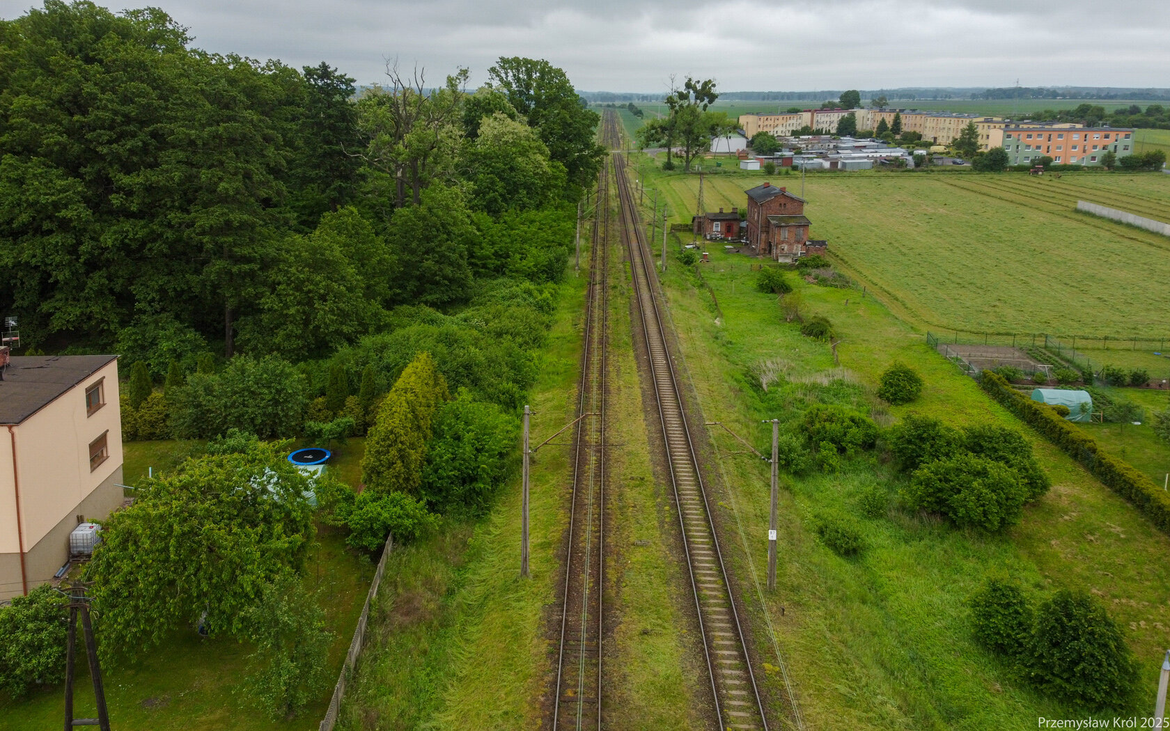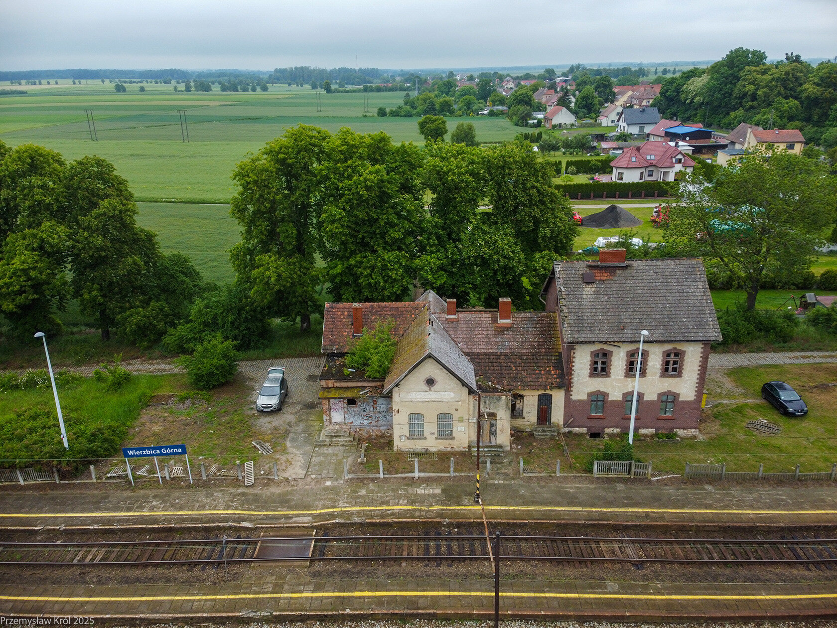 Ujęcie z powietrza na opuszczony budynek dworca kolejowego we Wierzbicy Górnej.