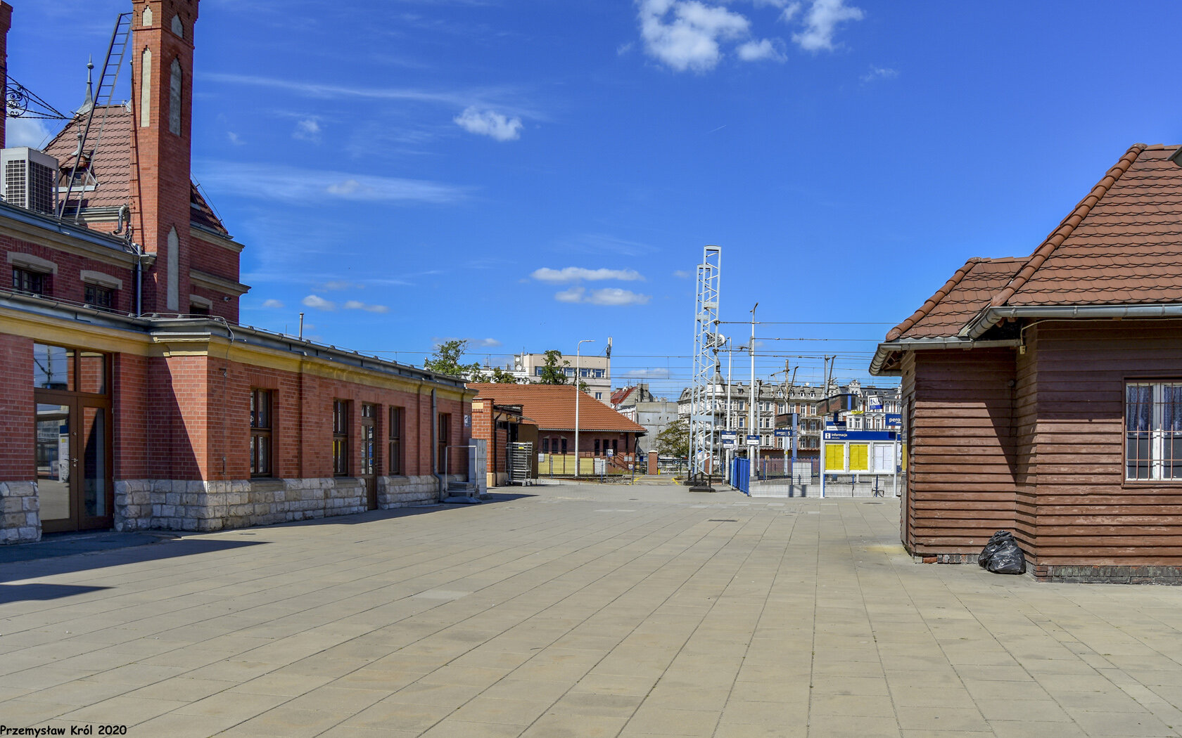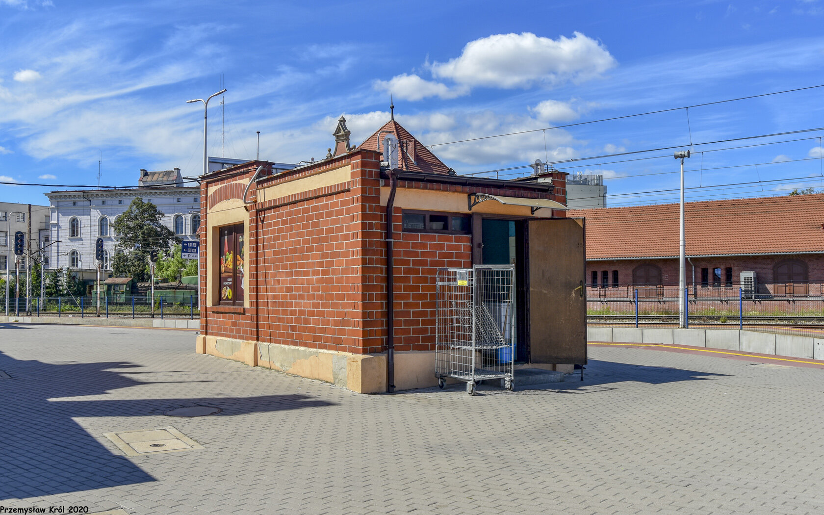 Kolejowy budynek gospodarczy w Opolu pomiędzy peronami stacji.