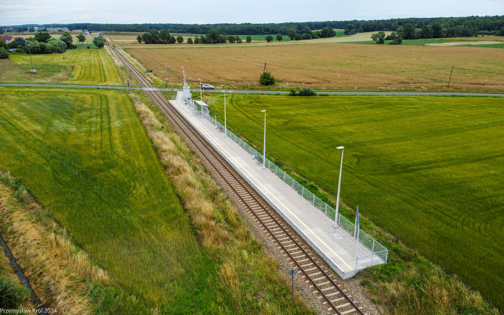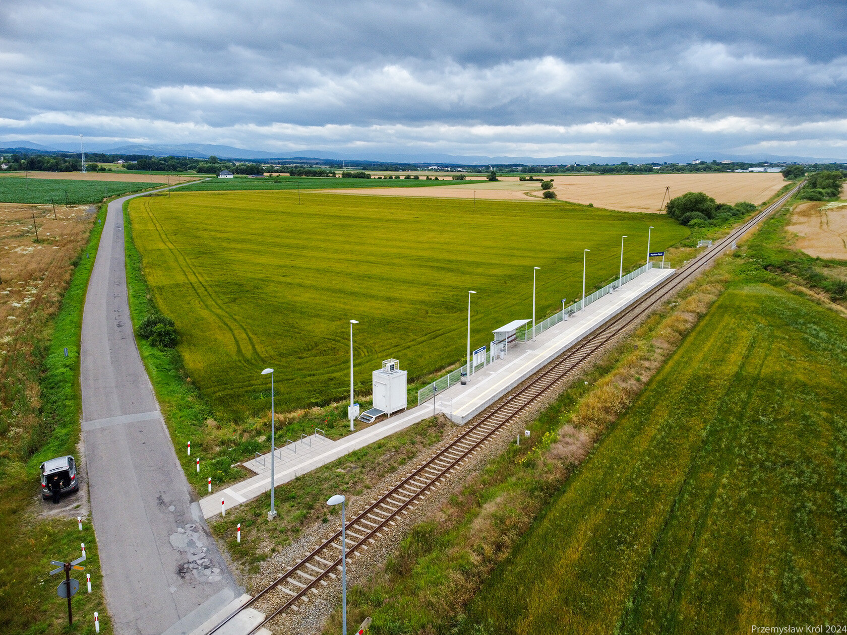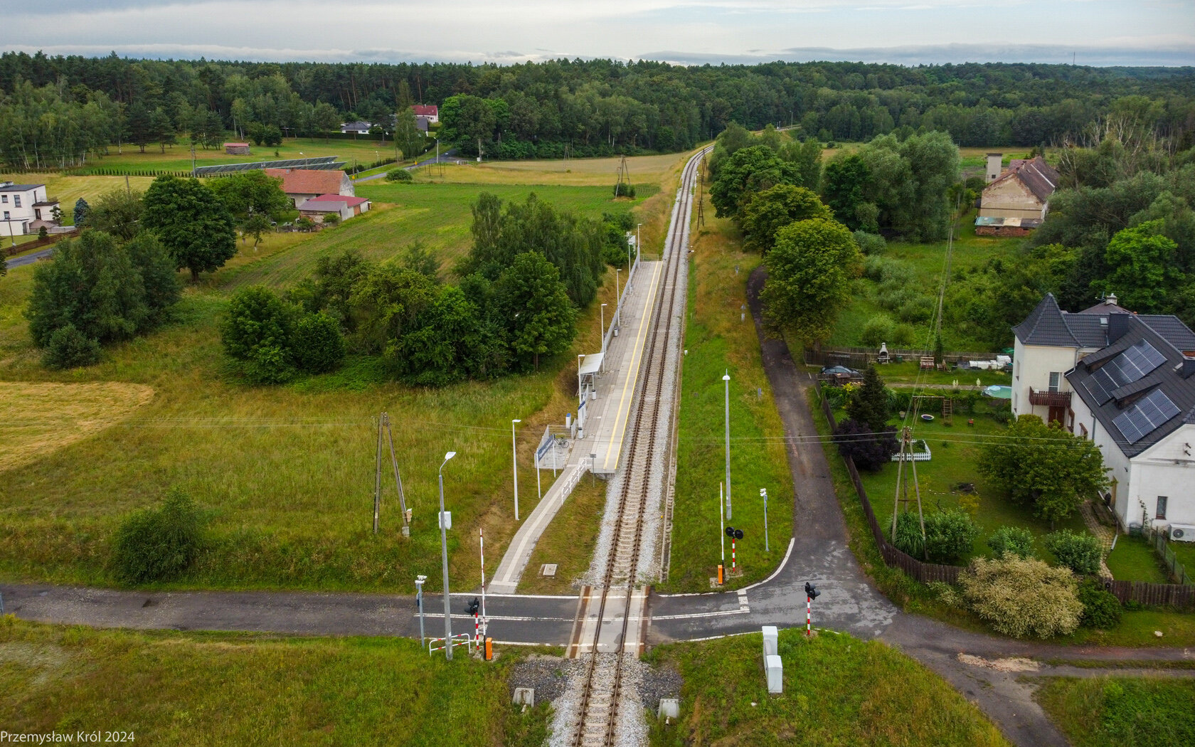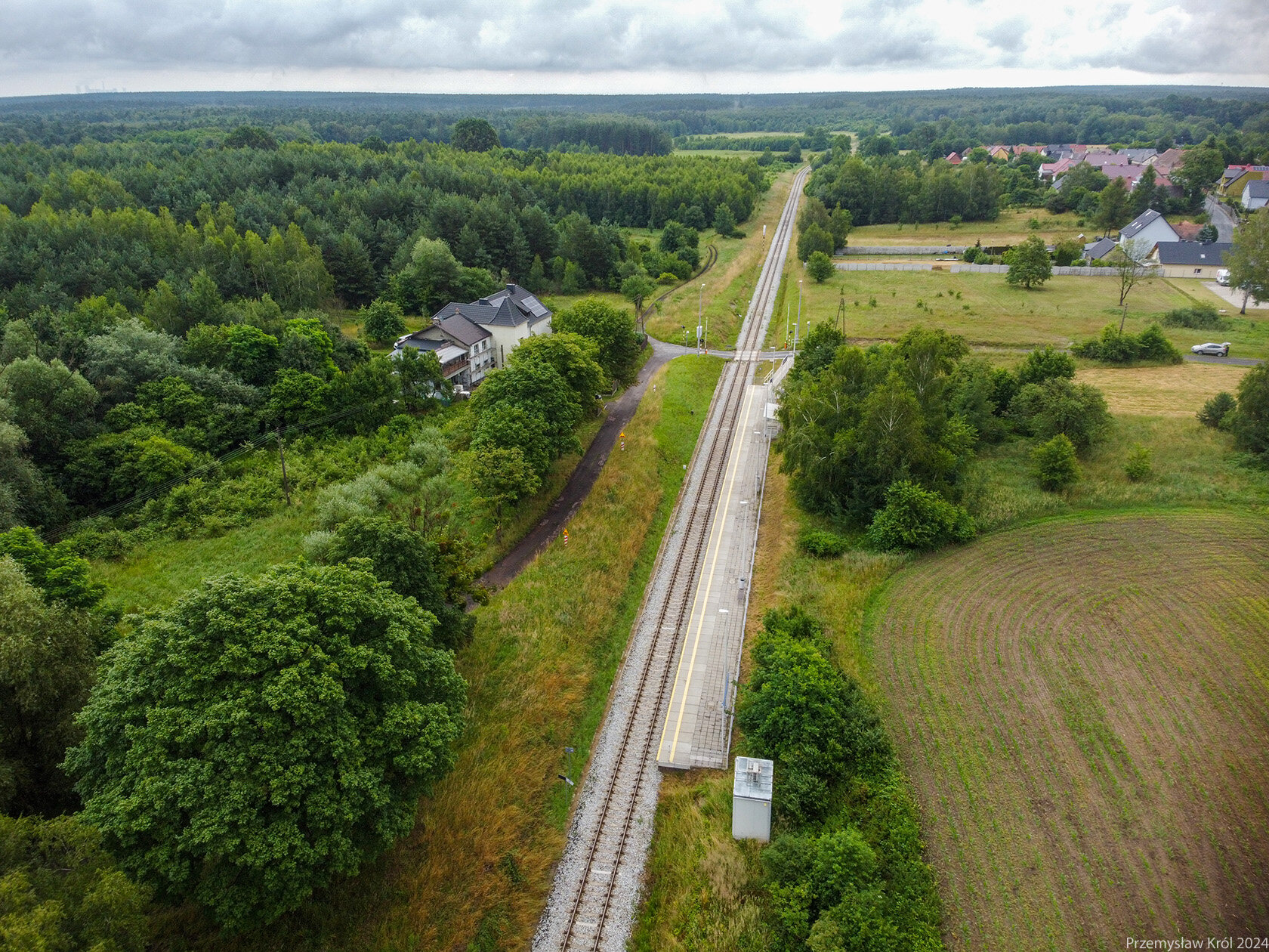 Ujęcie z drona na cały peron, przystanku osobowego od końca w stronę wyjścia.