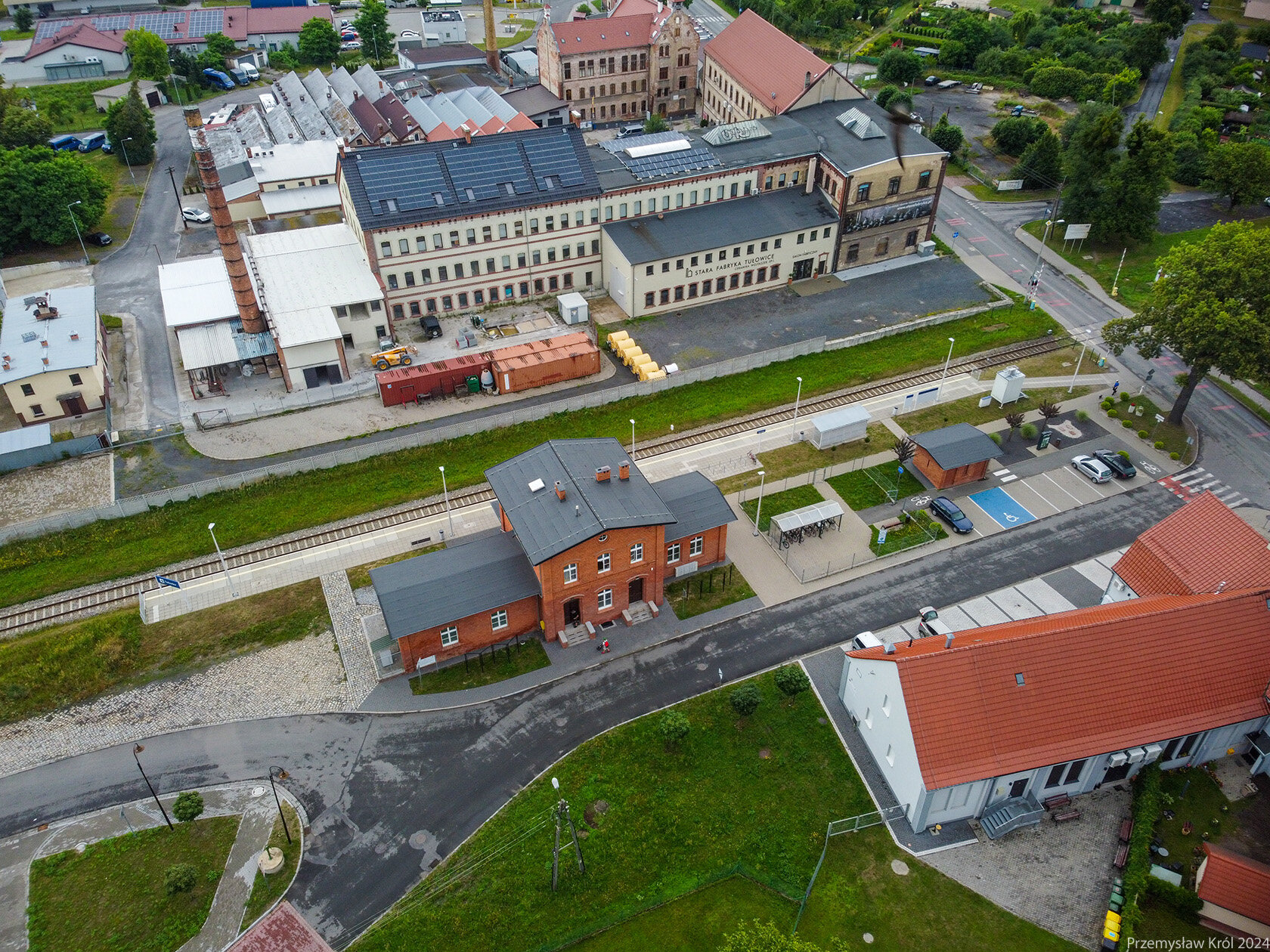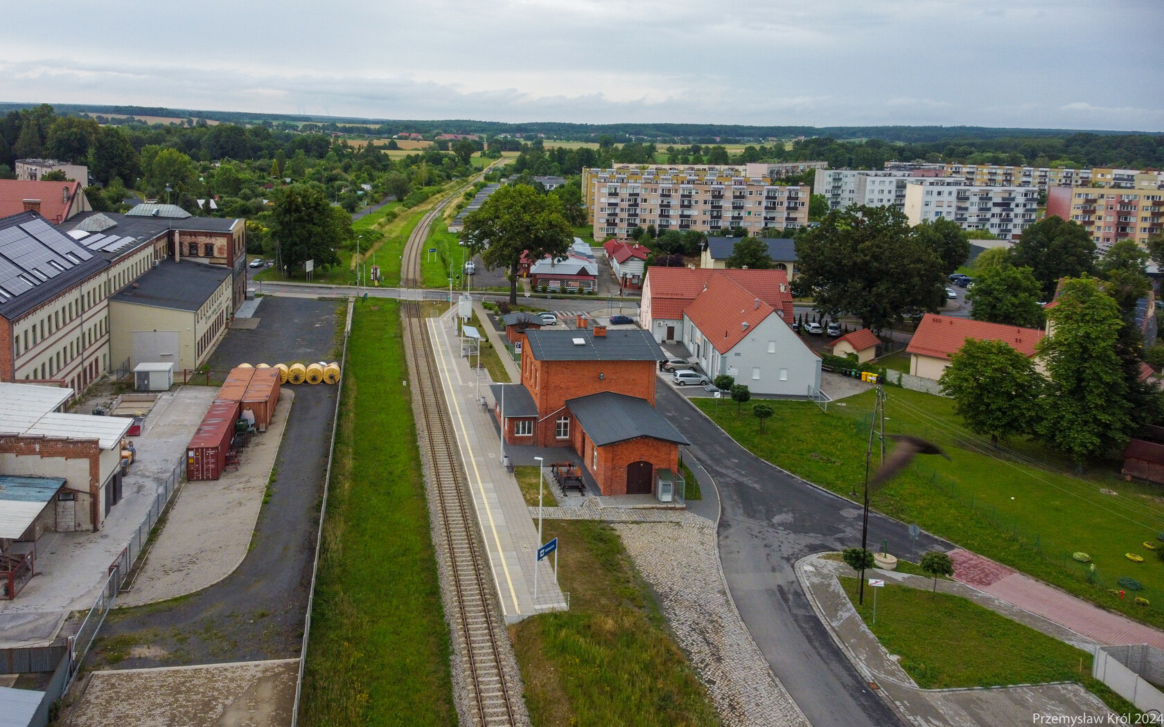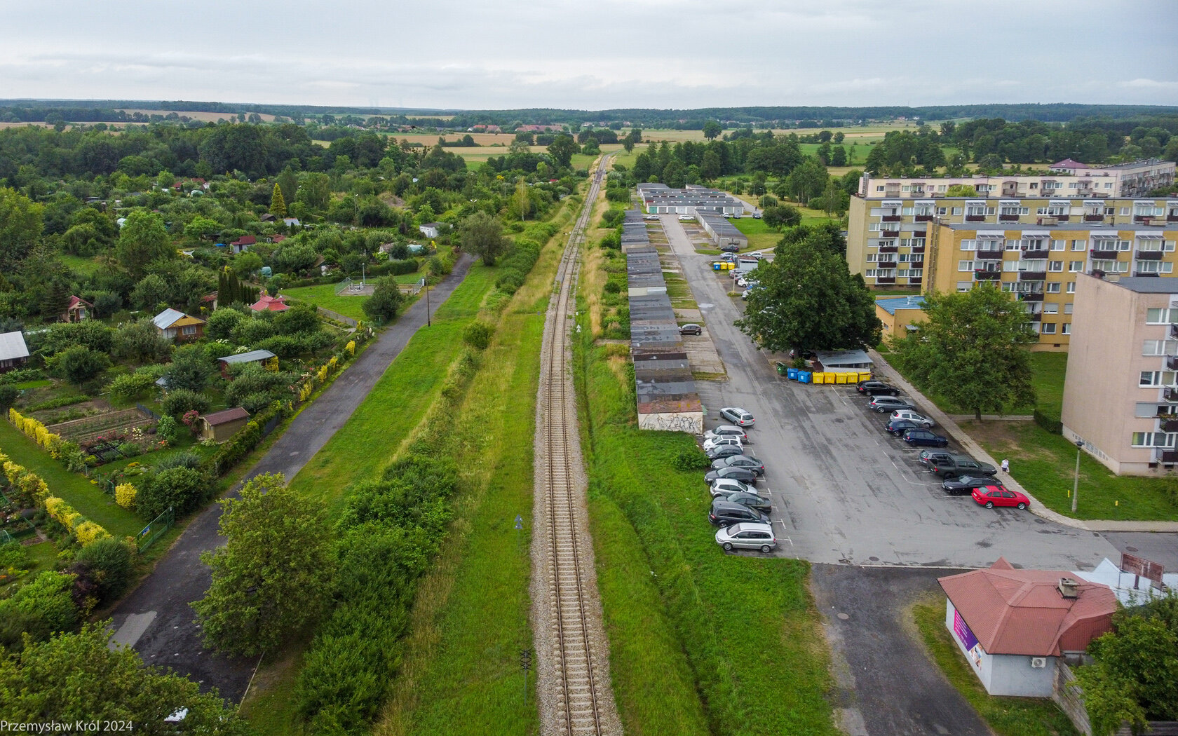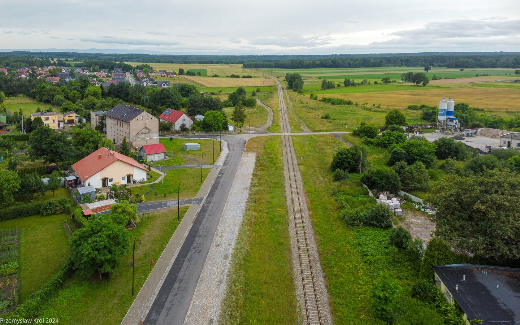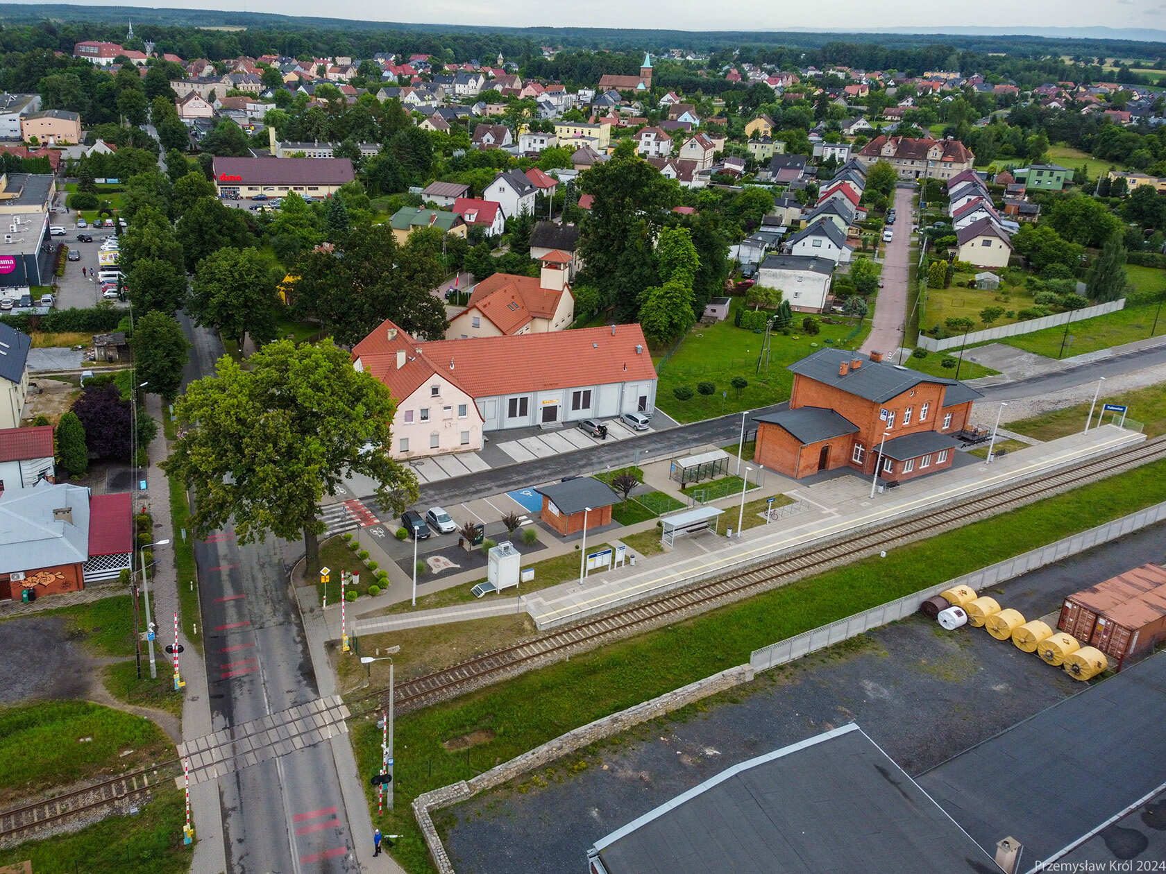 Ujęcie z drona na cały peron, przystanku osobowego od końca w stronę wyjścia.