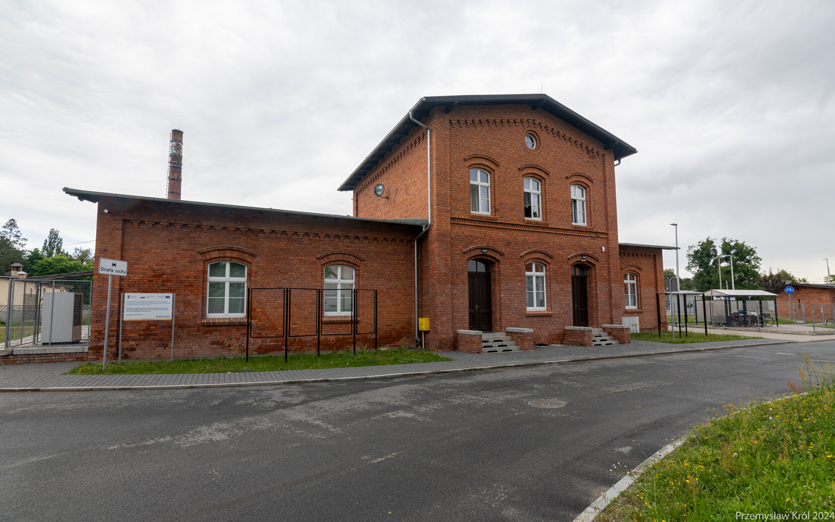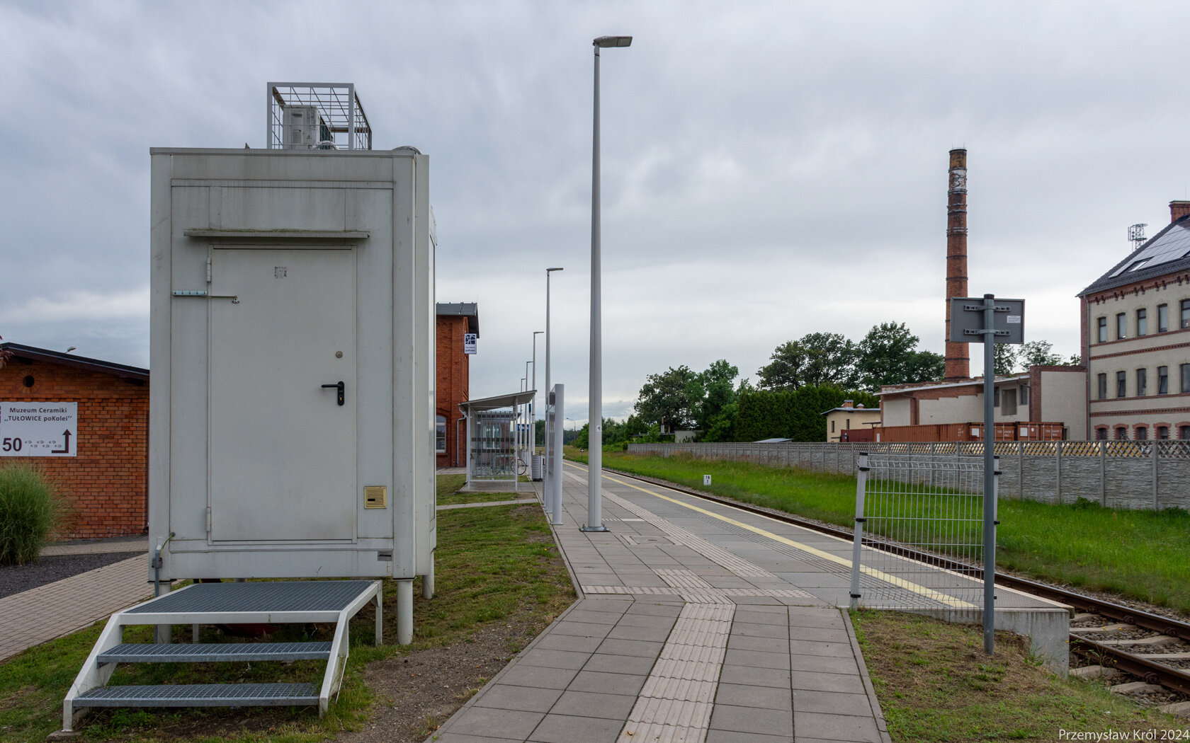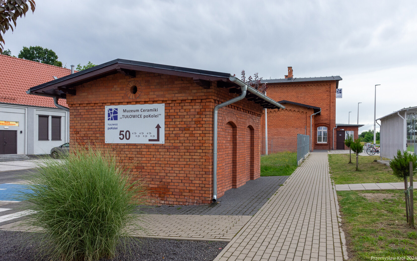 Odnowione budynki stacyjne oraz informacja o dojściu do muzeum ceramiki w Tułowicach.