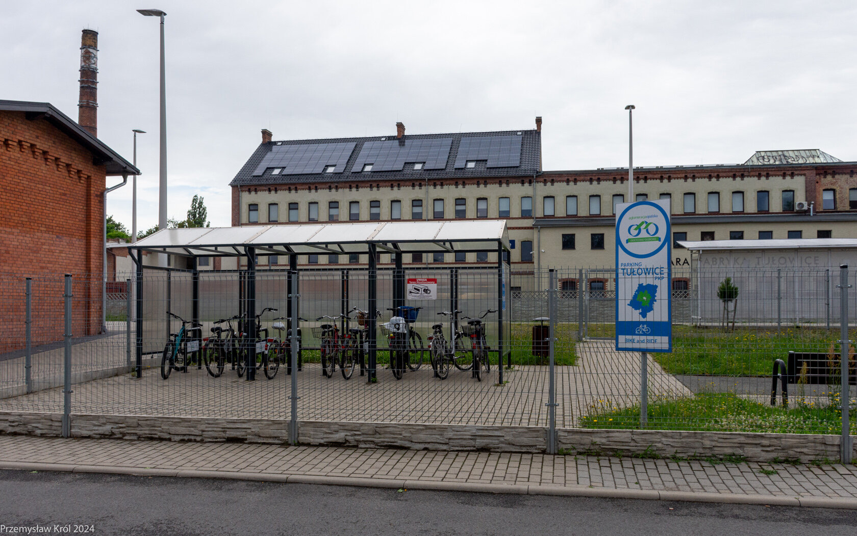 Mała tablica z nazwą stacji, nazwa stacji od mojej ostatniej wizyty została zmieniona, obok stojaki na rowery zamontowane przez PKP PLK, jak widać również w użyciu.