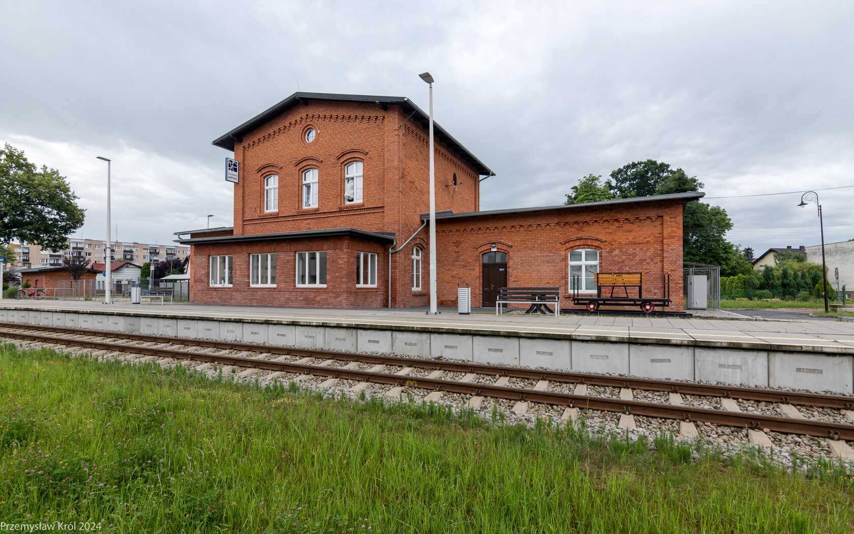 Odnowiony budynek dworca kolejowego od strony drogi dojazdowej.