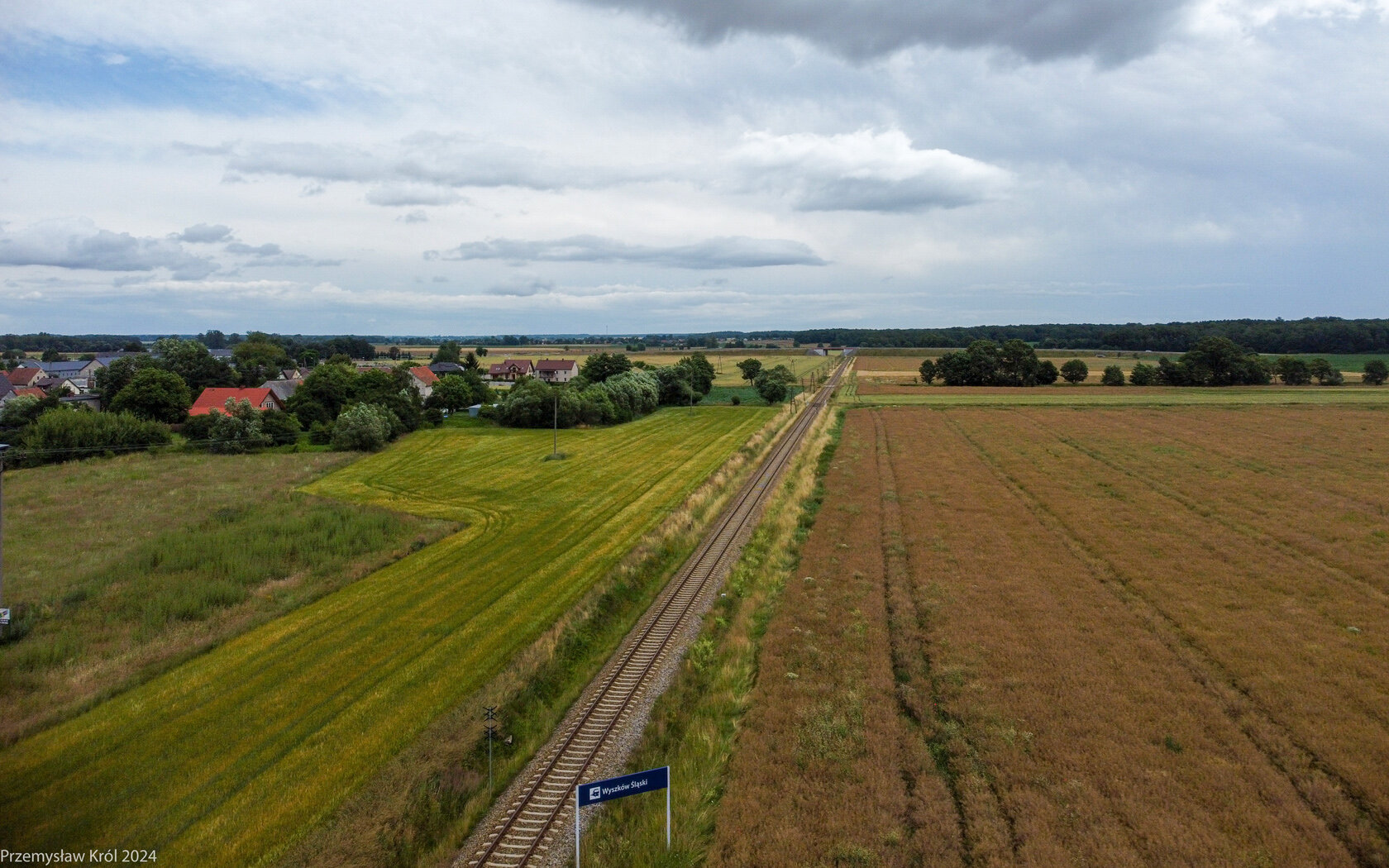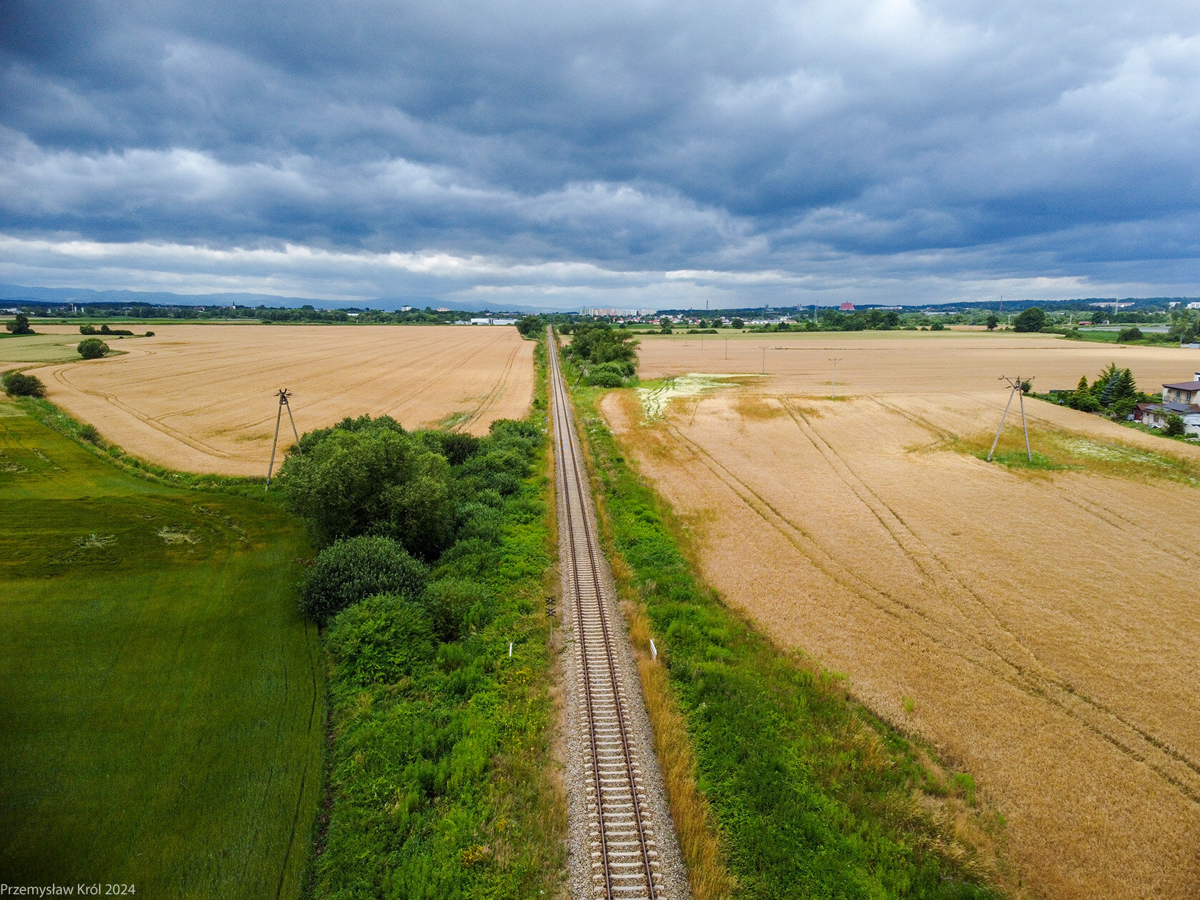 Kadr z powietrza w kierunku stacji Szydłów oraz dalej na Opole.