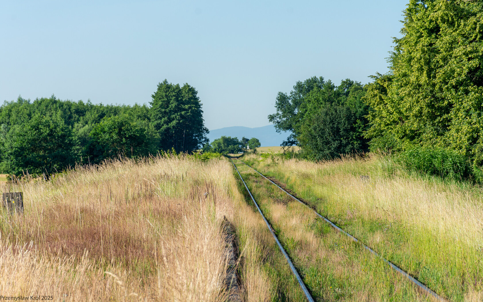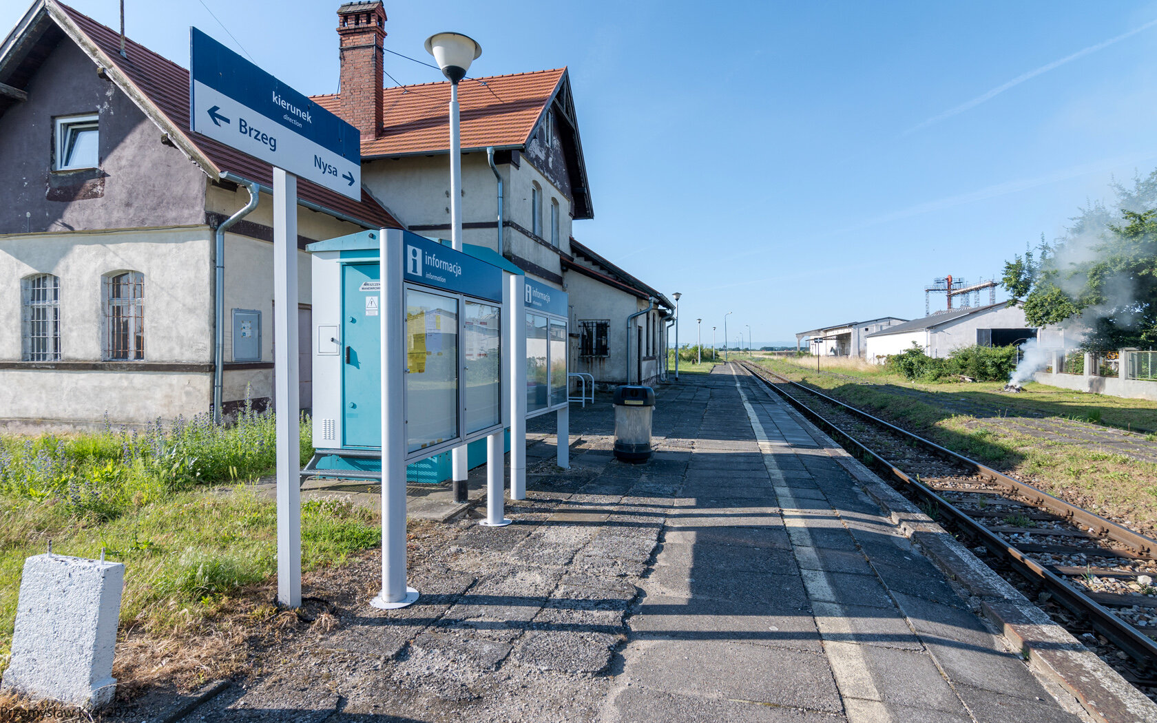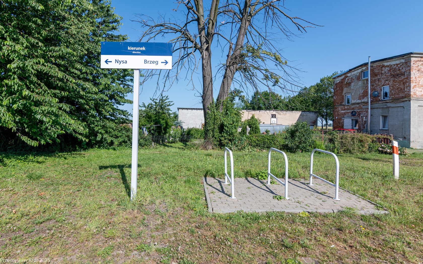 Znacznik W4 w kierunku Nysy, od tej właśnie stacji jest około 15 kilometrów kolejowych.