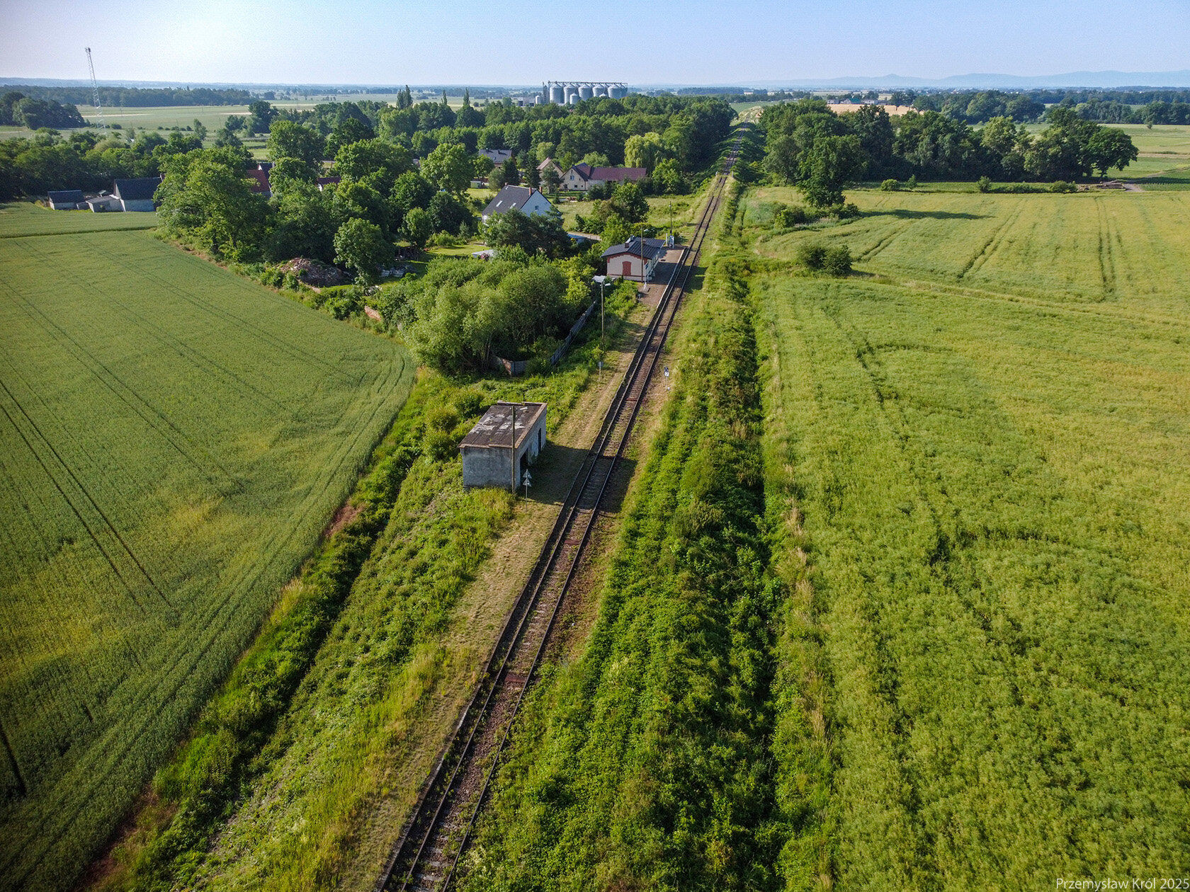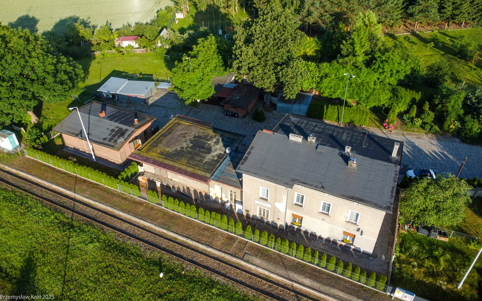 Niepełniący już funkcji dworca budynek, ujęcie z powietrza.
