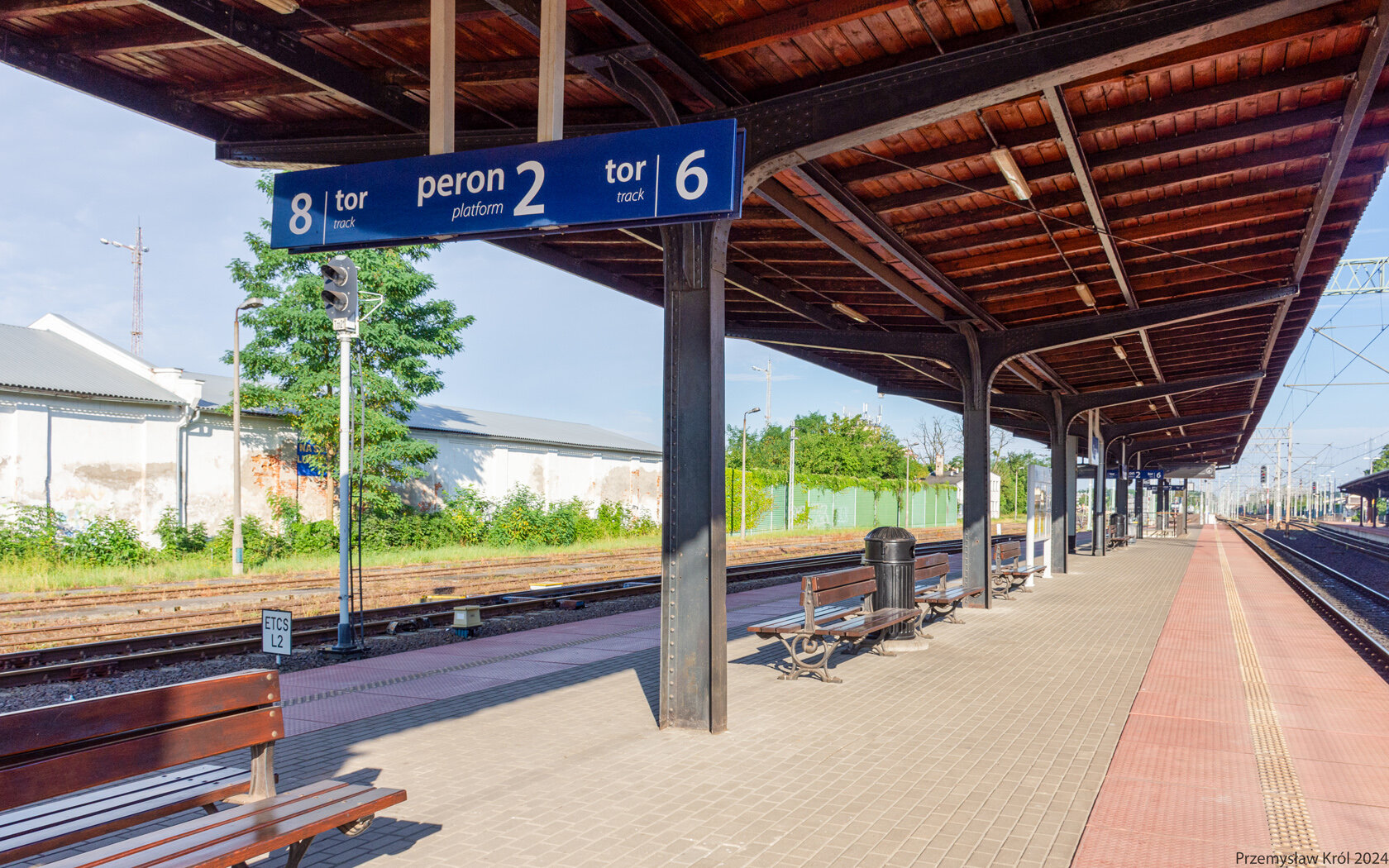 Widok na peron oraz elementy małej architektury dla pasażerów.