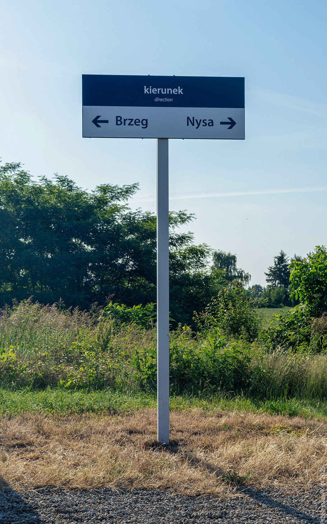Tablica kierunkowa wskazuje dwa główne kierunki jazdy na Nysę oraz Brzeg.