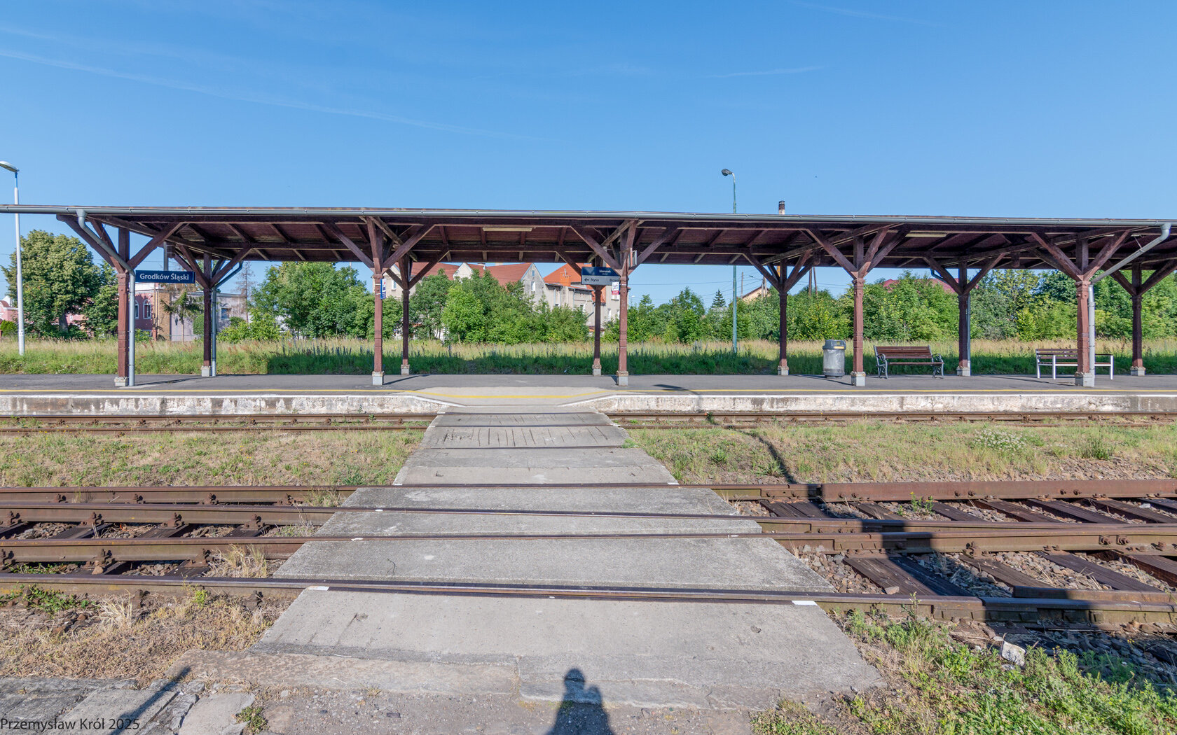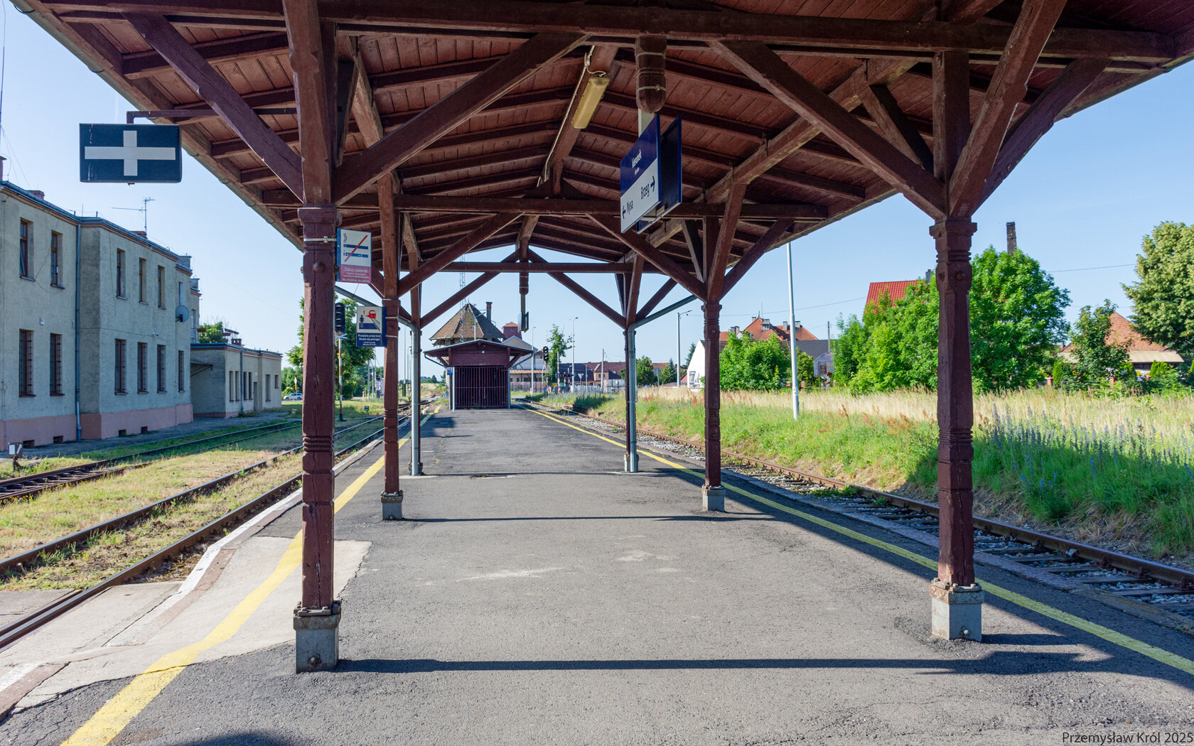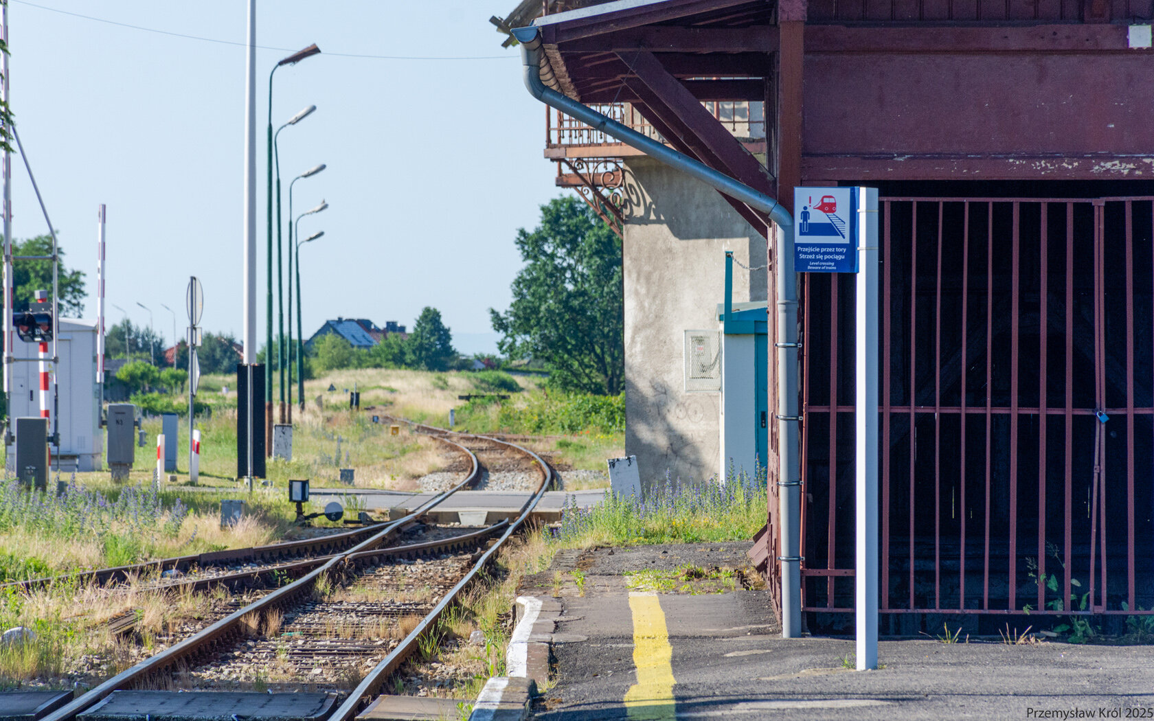 Do peronu można dostać się przechodząc przez tory w dwóch wyznaczonych miejscach. Na zdjęciu pierwsze przejście przez tory z pod budynku dworca.