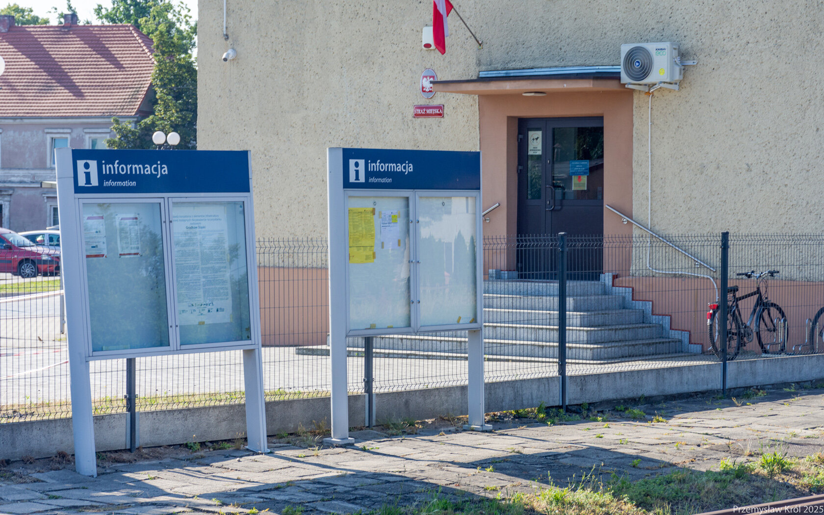 Tablice informacyjne zamontowane na dojściu do budynku dworca.