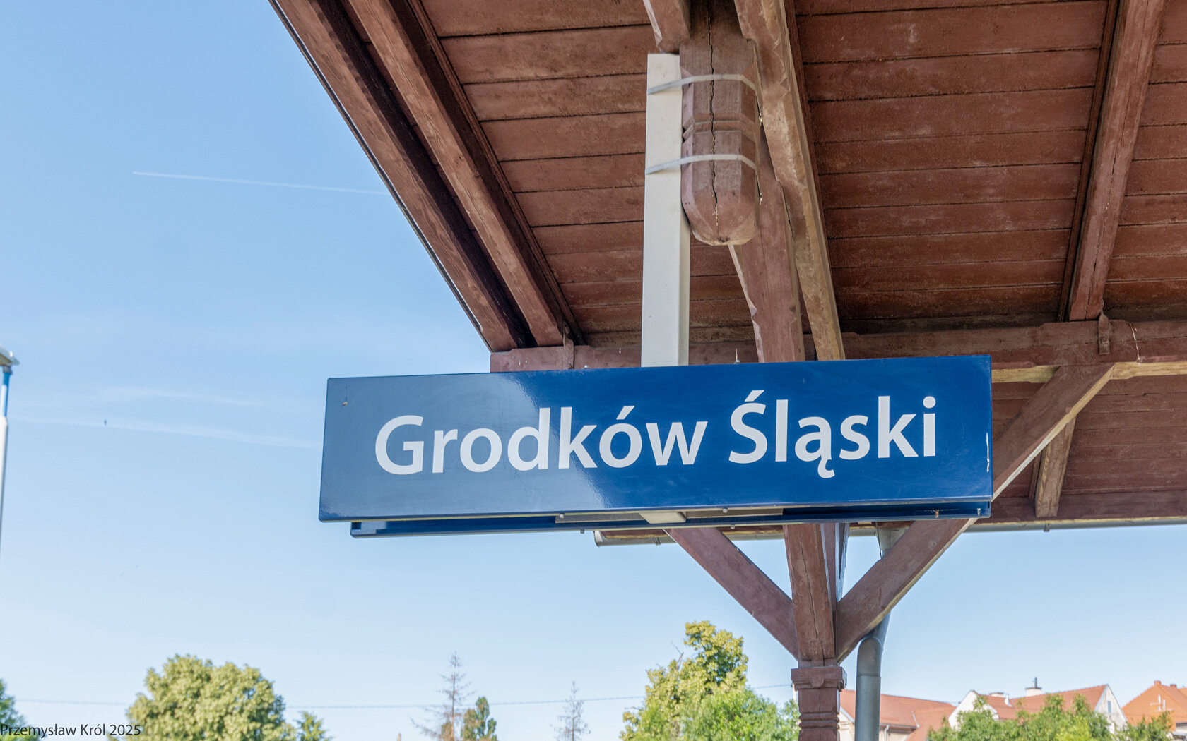 Podwieszana pod wiatę peronową mała tablica z nazwą stacji.