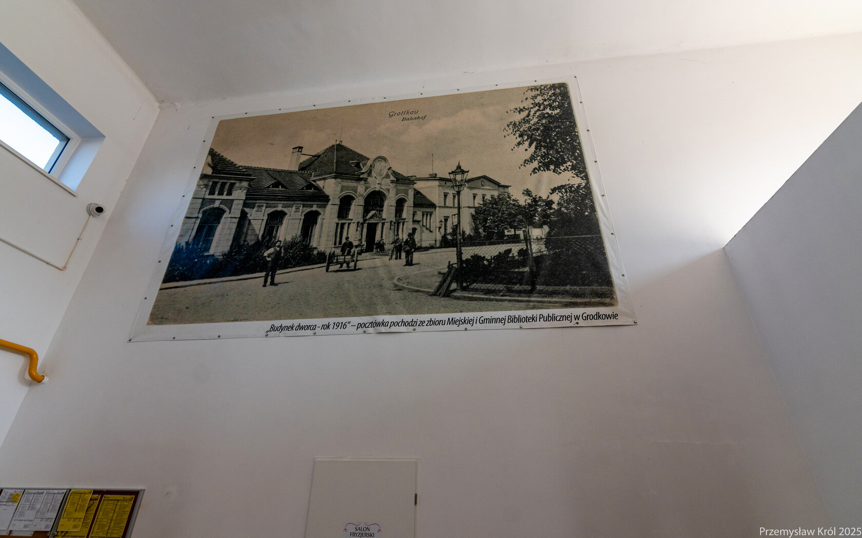 Wewnątrz dworca znajduje się przedruk starego zdjęcia ukazującego budynek dworca.