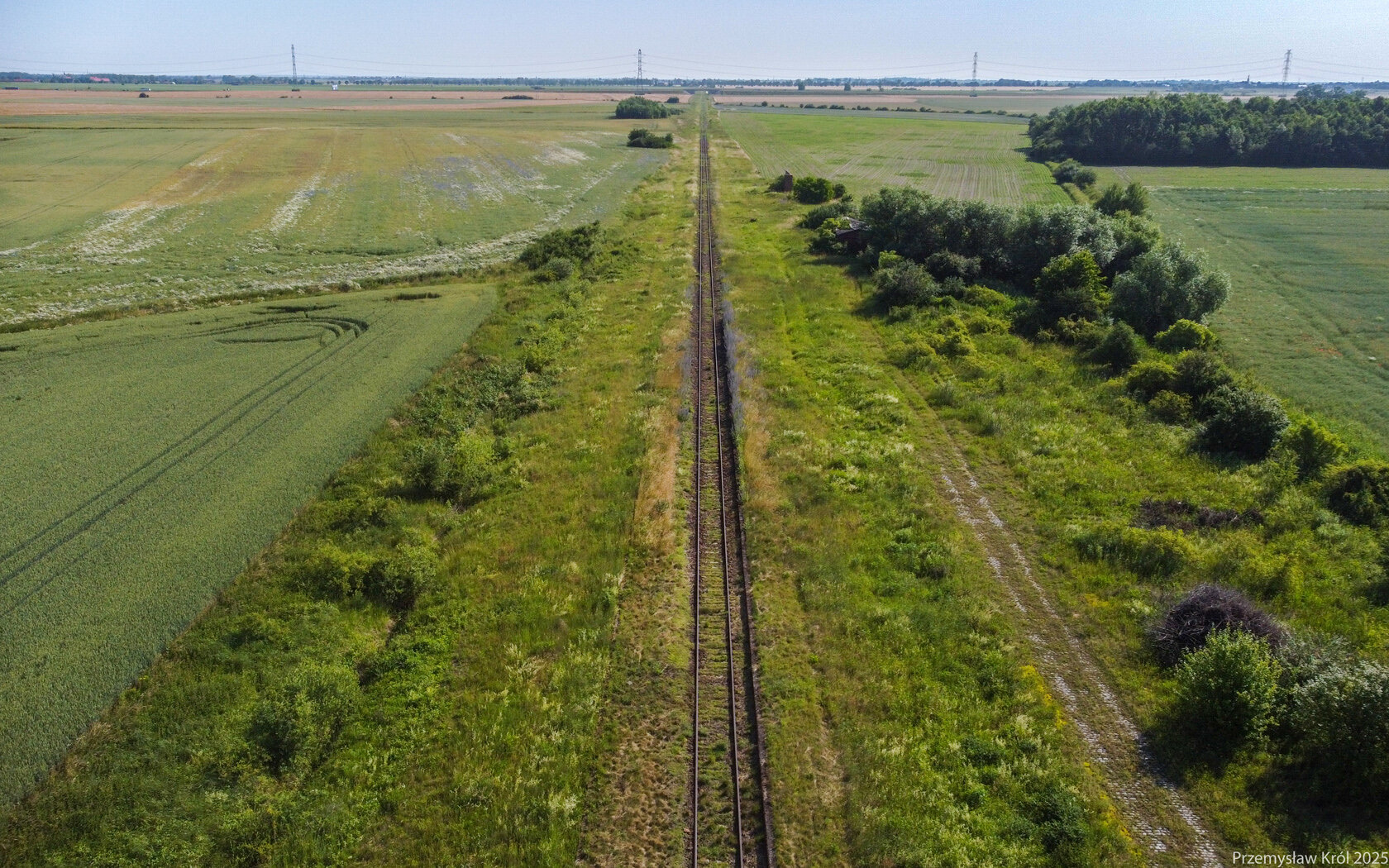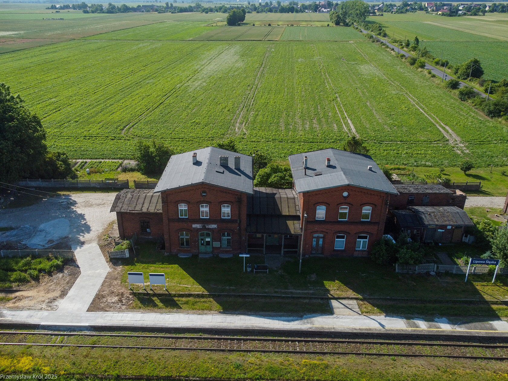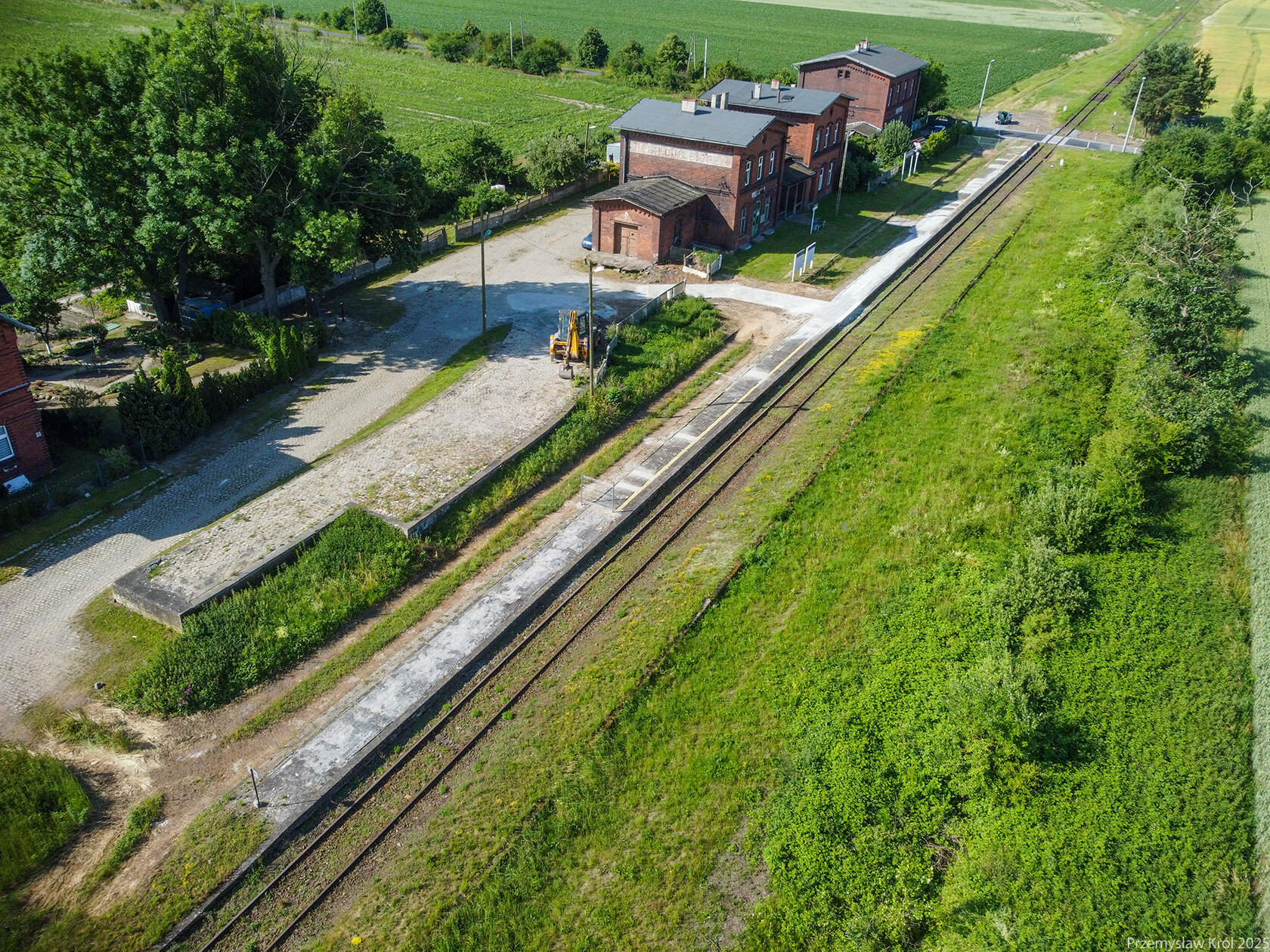 Zdjęcie z drona na cały peron od przejazdu, choć wejście będzie od zabudowań.