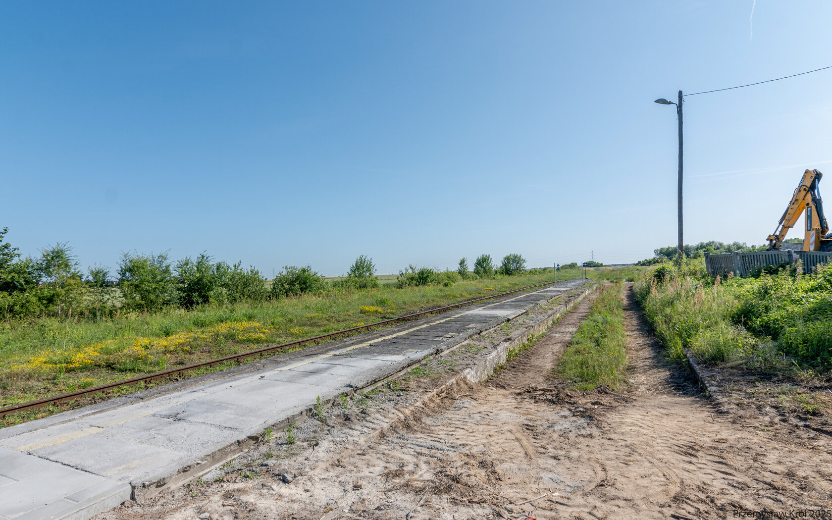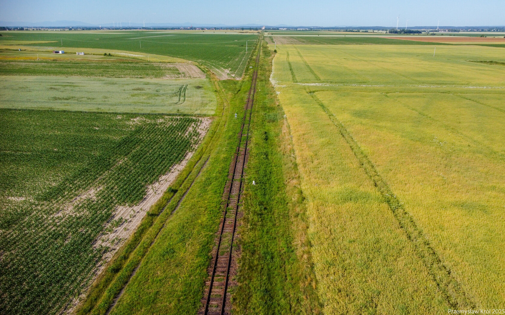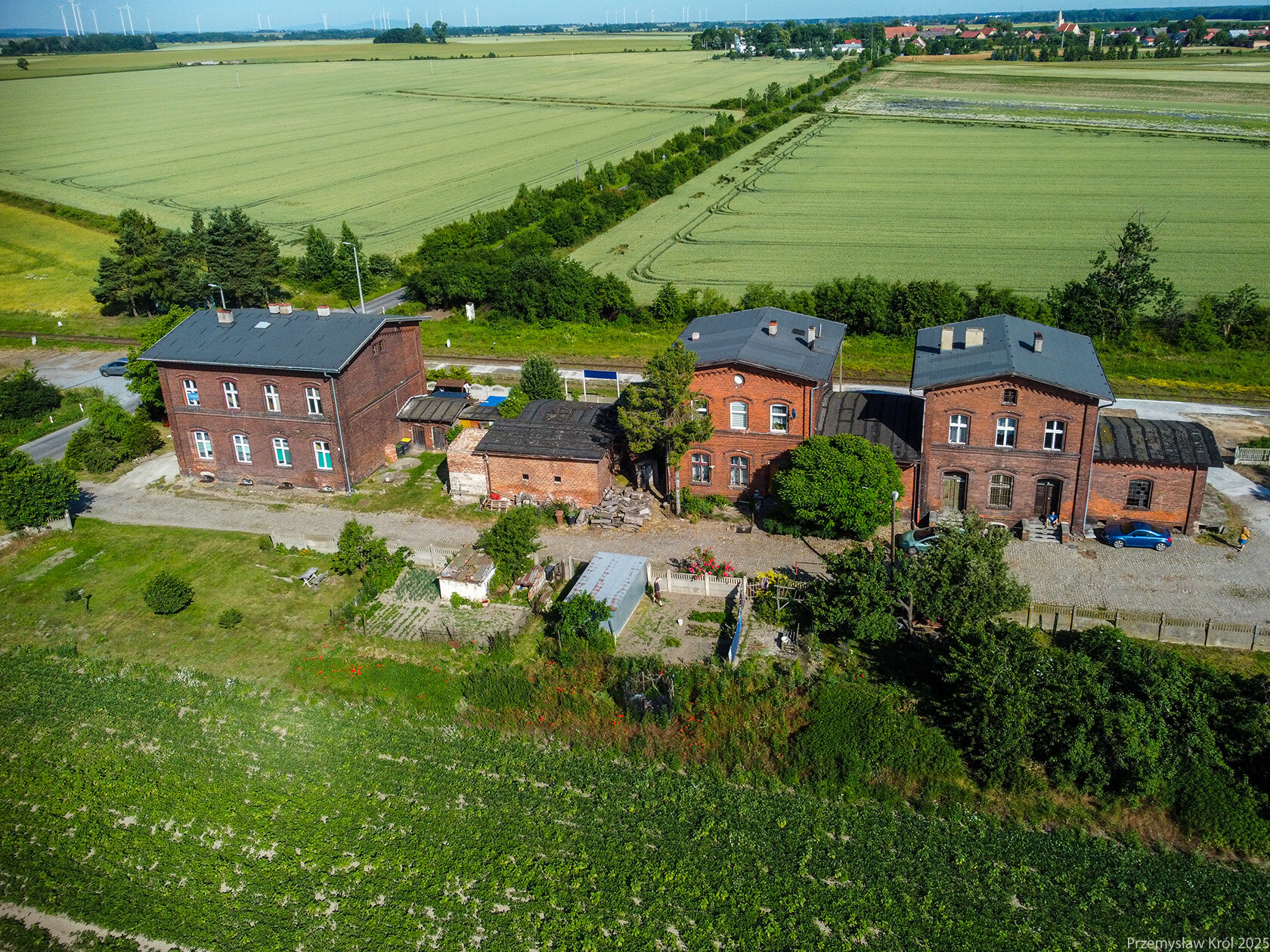 Zdjęcie z drona na cały peron od przejazdu, choć wejście będzie od zabudowań.