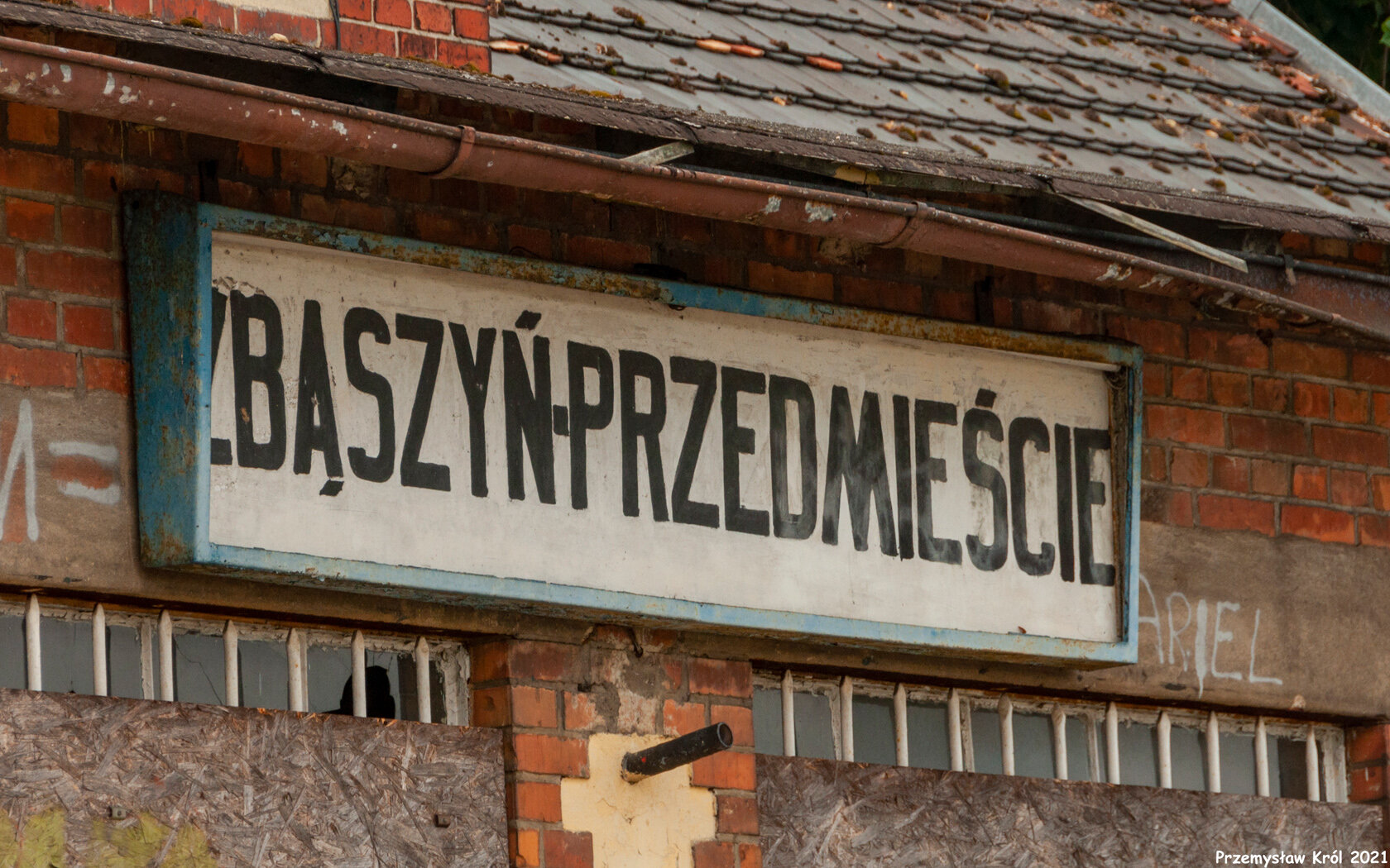 Na budynku dworca od strony torów widnieje stary napis z nazwą stacji kolejowej.