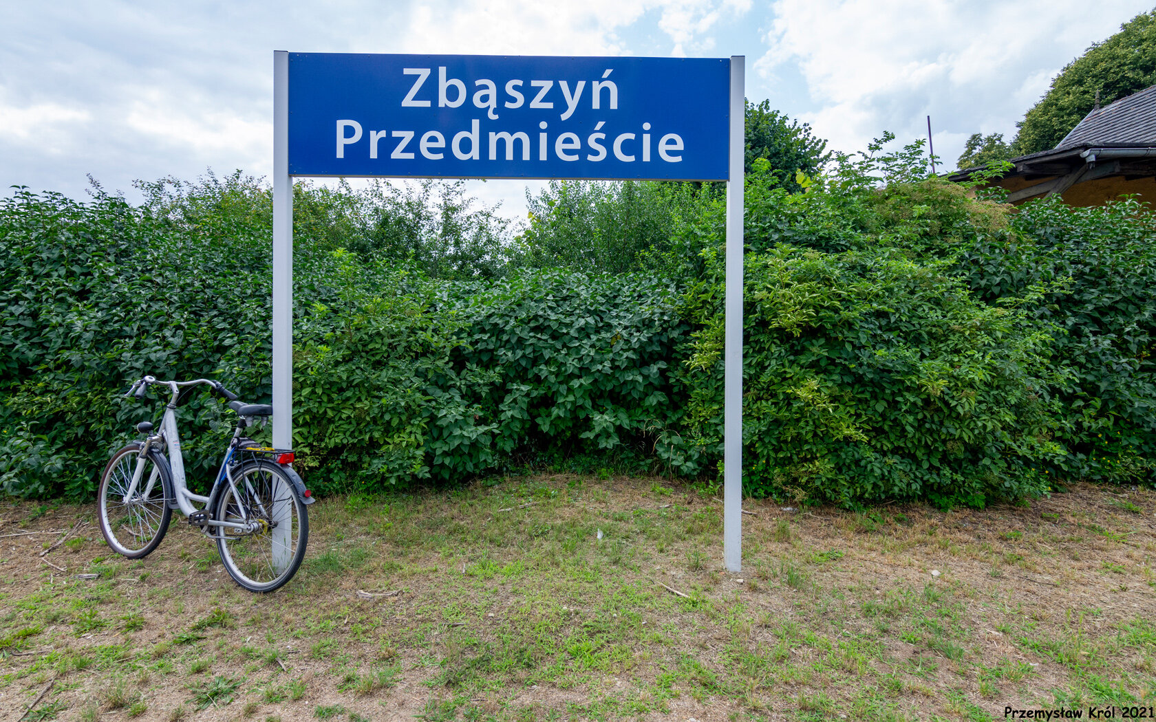 Współczesna tablica z nazwą stacji obok przypięty rower, choć są stojaki i tak pasażerowie wolą przypinać jednoślady w innych miejscach niż te, które są do tego przeznaczone.